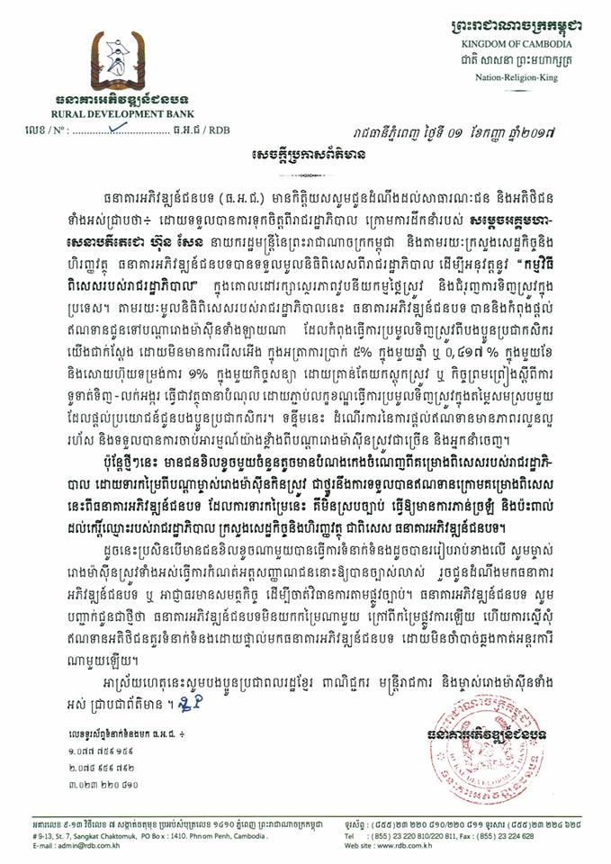 សេចក្តីប្រកាសព័ត៌មានអំពីតម្លៃស្រូវអ៊ីអ៊ែ តាមបណ្តាខេត្តមួយចំនួនរបស់ធនាគារអភិវឌ្ឍន៍ជនបទ