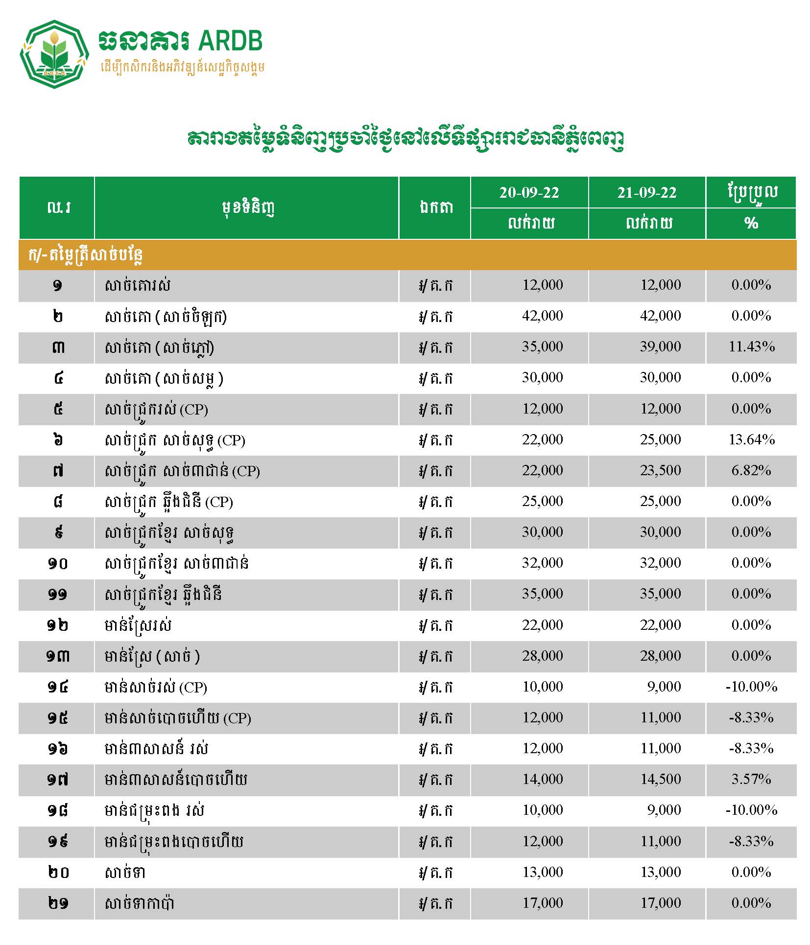 តម្លៃទំនិញមួយចំនួននៅរាជធានីភ្នំពេញថ្ងៃទី ២០-២១ កញ្ញា ២០២២