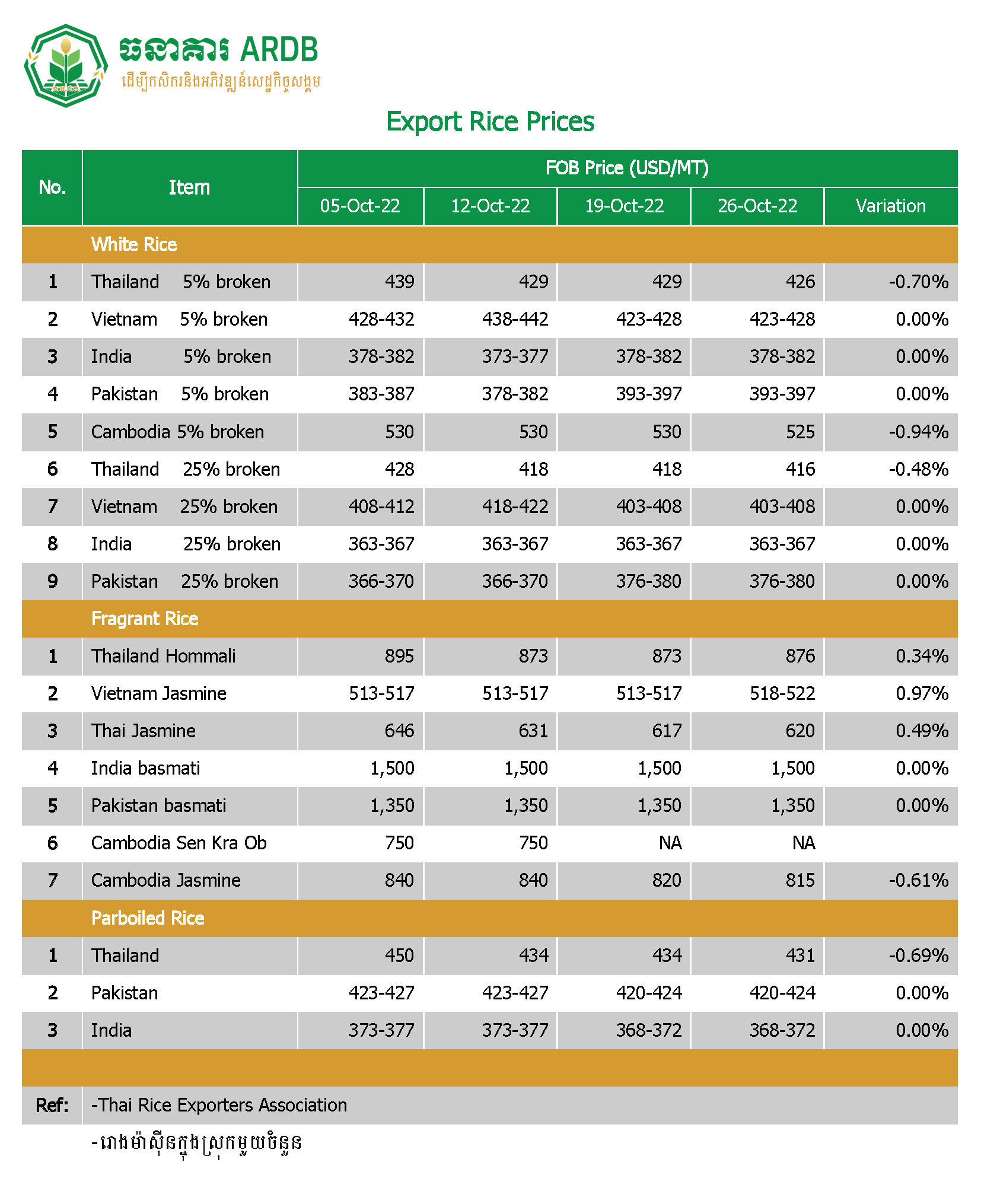 តម្លៃអង្ករនាំចេញគិតត្រឹមថ្ងៃទី២៦ ខែតុលា ឆ្នាំ២០២២