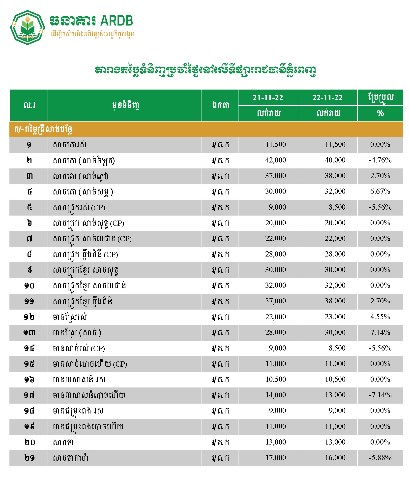 តម្លៃទំនិញមួយចំនួននៅរាជធានីភ្នំពេញថ្ងៃទី ២១-២២ វិច្ឆិកា ២០២២