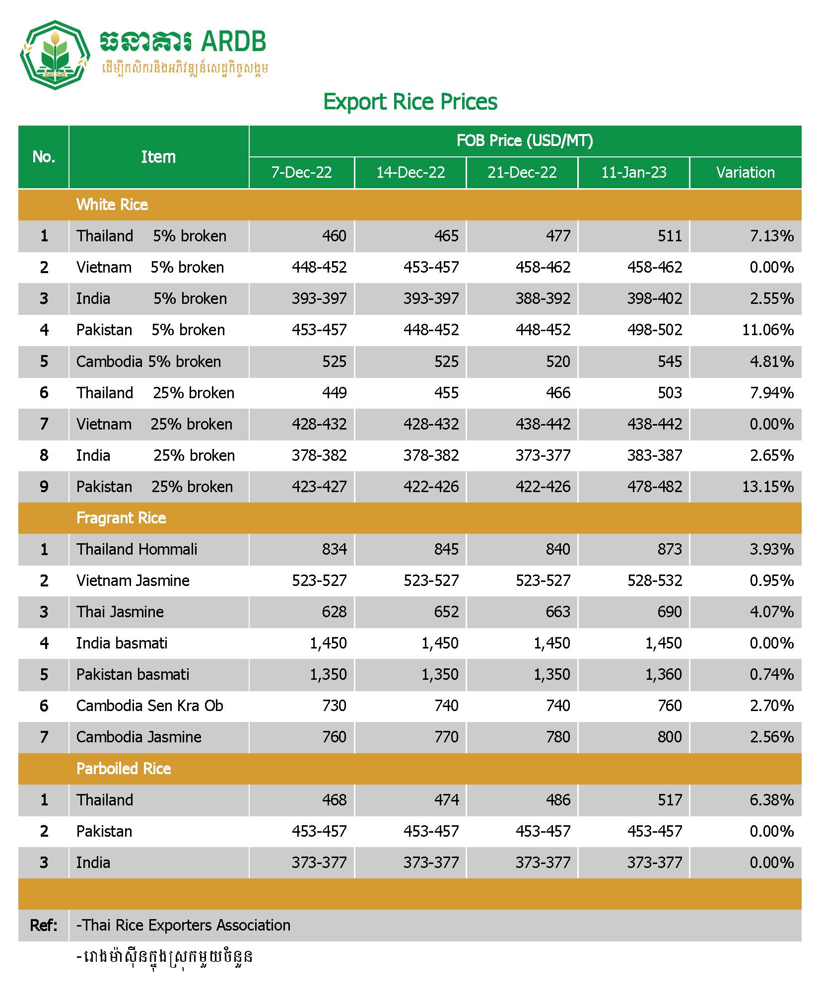 13 មករា 2023 តម្លៃអង្ករនាំចេញគិតត្រឹមថ្ងៃទី១១ ខែមករា ឆ្នាំ២០២៣ អង់គ្លេស(PDF,82.14 KB) Post navigation Previous តម្លៃទំនិញមួយចំនួននៅរាជធានីភ្នំពេញថ្ងៃទី ១១-១២ មករា ២០២៣Next តម្លៃទំនិញមួយចំនួននៅរាជធានីភ្នំពេញថ្ងៃទី ១២-១៣ មករា ២០២៣