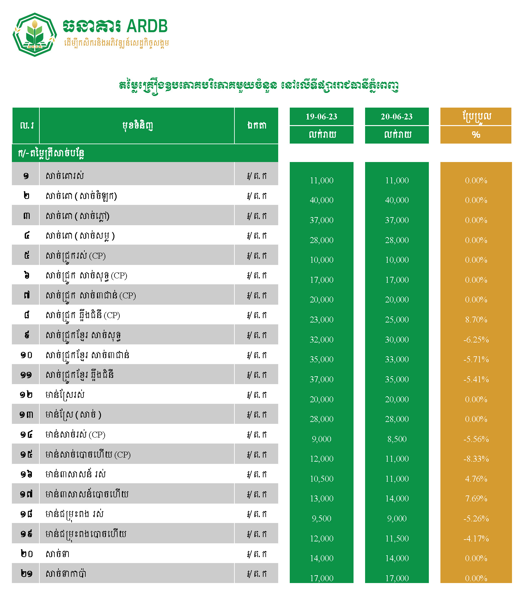 20 មិថុនា 2023 តម្លៃទំនិញមួយចំនួននៅរាជធានីភ្នំពេញថ្ងៃទី ១៩-២០ មិថុនា ២០២៣ ភាសាខ្មែរ(PDF,156.69 KB) Post navigation Previous តម្លៃទំនិញមួយចំនួននៅរាជធានីភ្នំពេញថ្ងៃទី ១៨-១៩ មិថុនា ២០២៣Next តម្លៃទំនិញមួយចំនួននៅរាជធានីភ្នំពេញថ្ងៃទី ២០-២១ មិថុនា ២០២៣