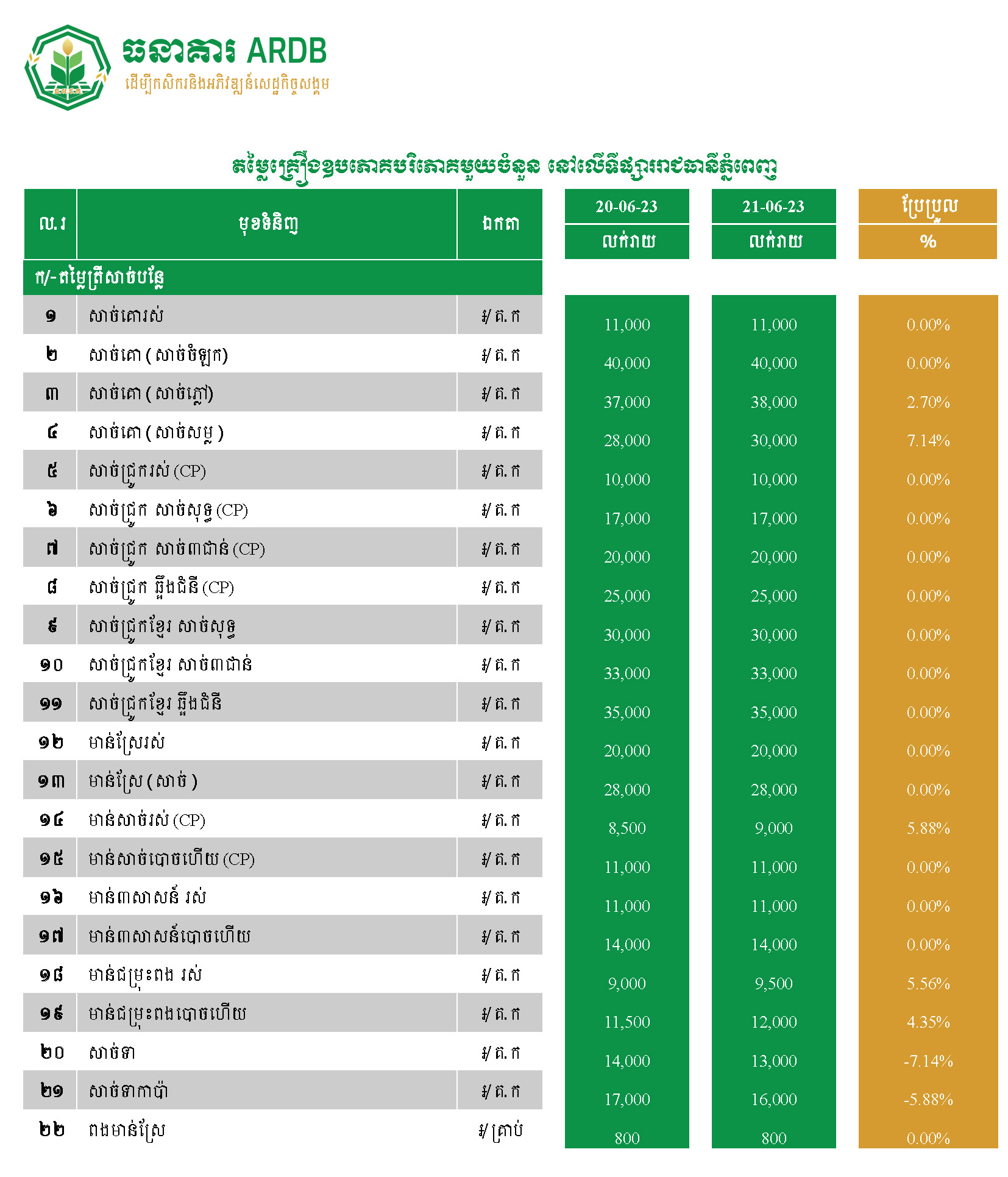 21 មិថុនា 2023 តម្លៃទំនិញមួយចំនួននៅរាជធានីភ្នំពេញថ្ងៃទី ២០-២១ មិថុនា ២០២៣ ភាសាខ្មែរ(PDF,190.13 KB) Post navigation Previous តម្លៃទំនិញមួយចំនួននៅរាជធានីភ្នំពេញថ្ងៃទី ១៩-២០ មិថុនា ២០២៣Next តម្លៃទំនិញមួយចំនួននៅរាជធានីភ្នំពេញថ្ងៃទី ២១-២២ មិថុនា ២០២៣