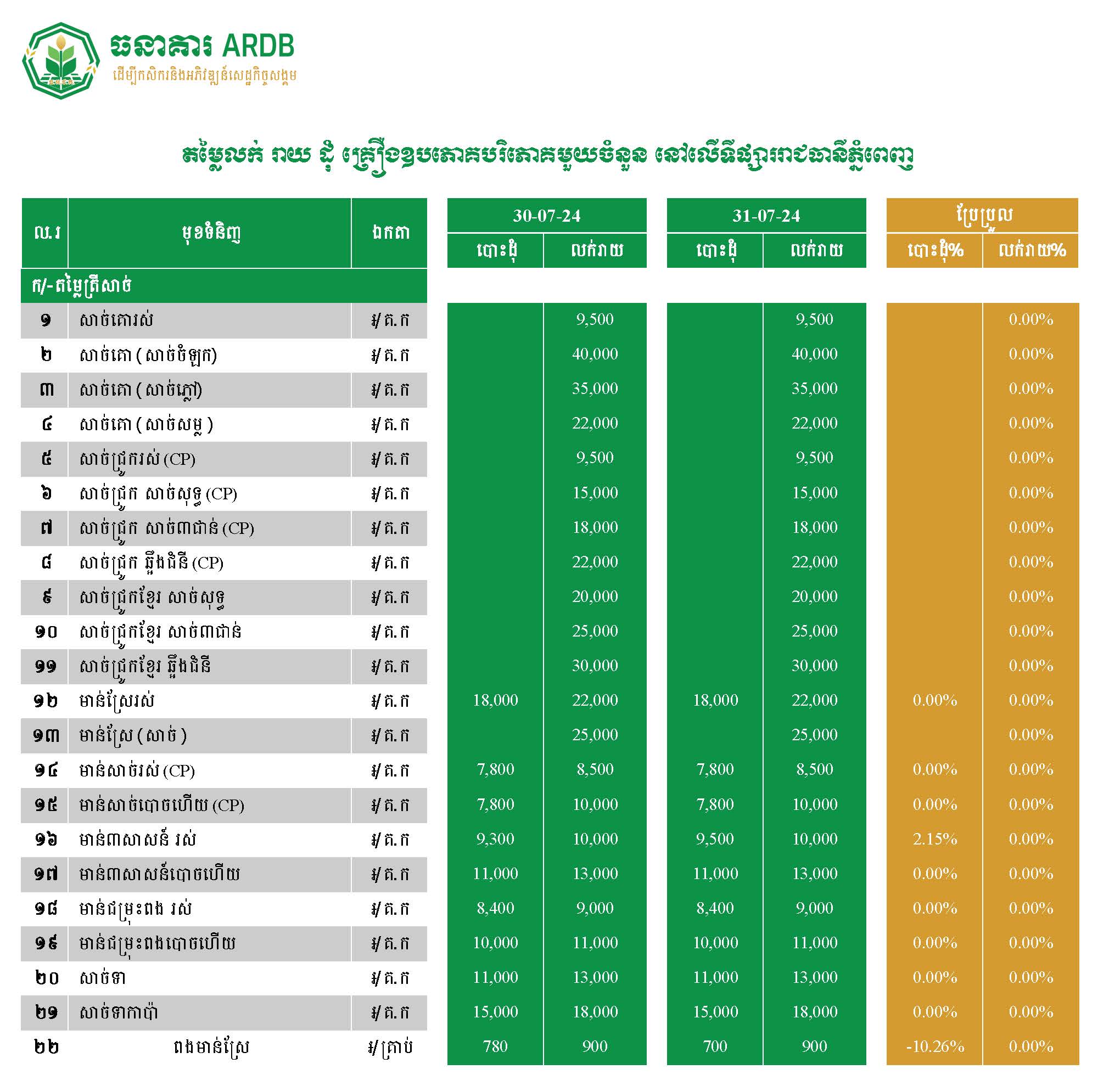 31 កក្កដា 2024 តម្លៃទំនិញមួយចំនួននៅរាជធានីភ្នំពេញថ្ងៃទី ៣០-៣១ កក្កដា ២០២៤ ភាសាខ្មែរ(PDF,174.03 KB) Post navigation Previous នៅទីស្នាក់ការកណ្តាល ធនាគារអភិវឌ្ឍន៍ជនបទ និងកសិកម្មបានរៀបចំកិច្ចប្រជុំបុគ្គលិកប្រចាំឆមាសទី១ ឆ្នាំ២០២៤Next តម្លៃទំនិញមួយចំនួននៅរាជធានីភ្នំពេញថ្ងៃទី ៣១-០១ សីហា ២០២៤