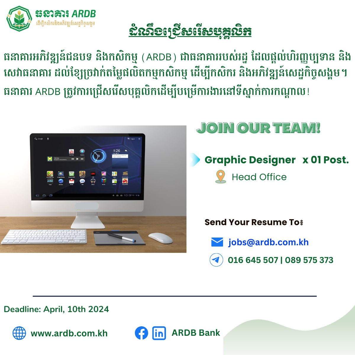 បេក្ខជនដែលមានចំណាប់អារម្មណ៍ សូមផ្ញើ CV មកតាមរយៈ jobs@ardb.com.kh ឬពិនិត្យមើលព័ត៌មានលម្អិត.