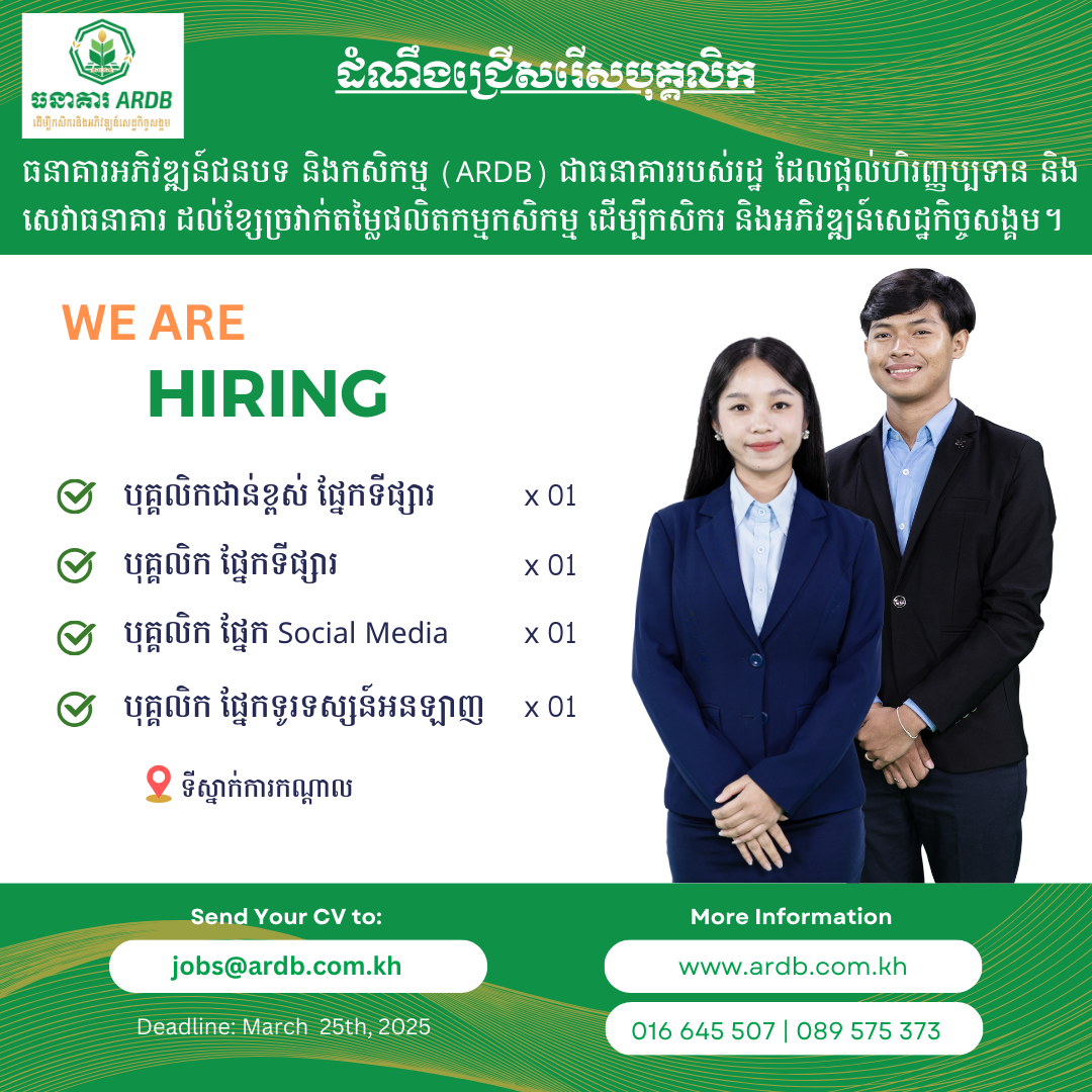 បេក្ខជនដែលមានចំណាប់អារម្មណ៍ សូមផ្ញើ CV មកតាមរយៈ jobs@ardb.com.kh ឬពិនិត្យមើលព័ត៌មានលម្អិត.