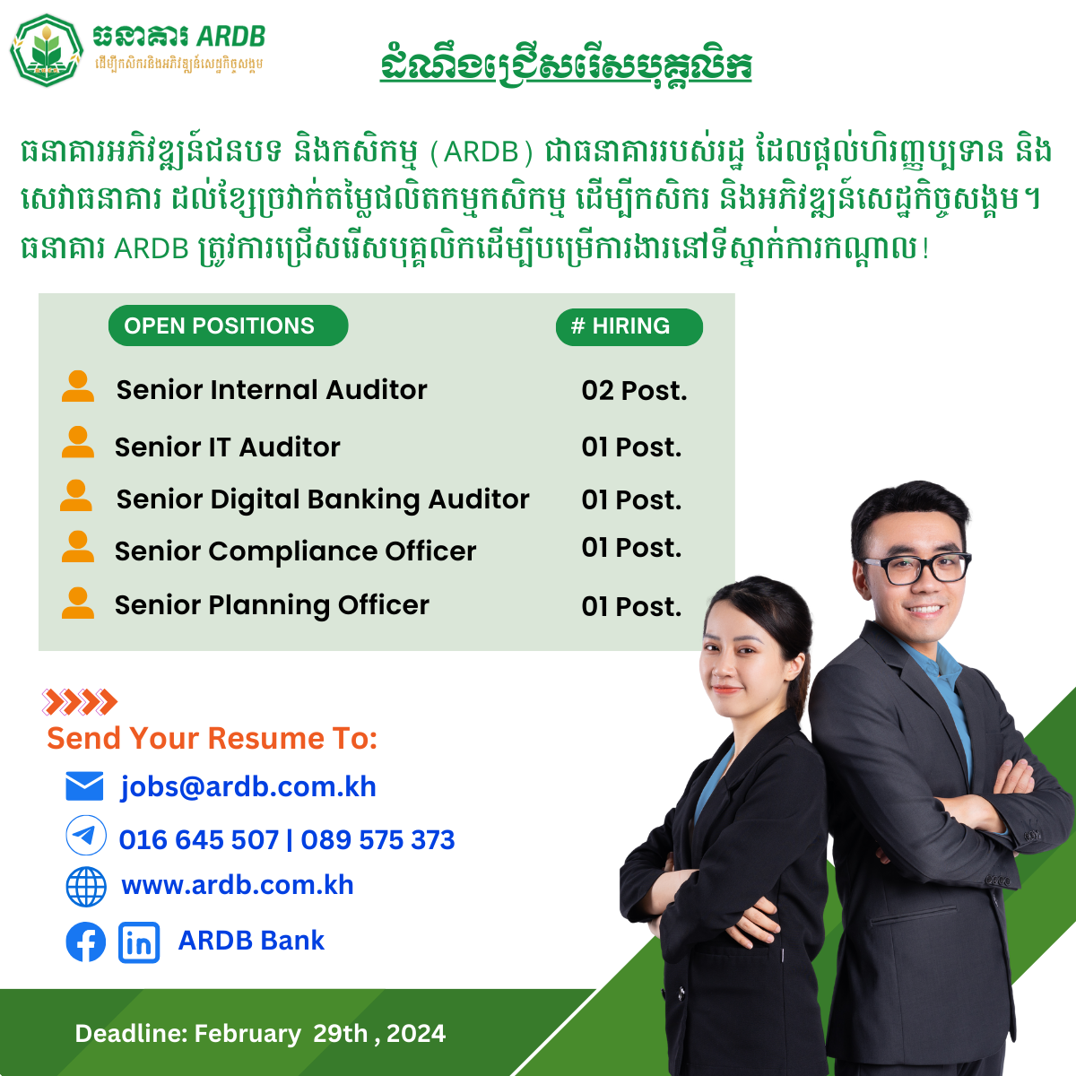 បេក្ខជនដែលមានចំណាប់អារម្មណ៍ សូមផ្ញើ CV មកតាមរយៈ jobs@ardb.com.kh ឬពិនិត្យមើលព័ត៌មានលម្អិត.