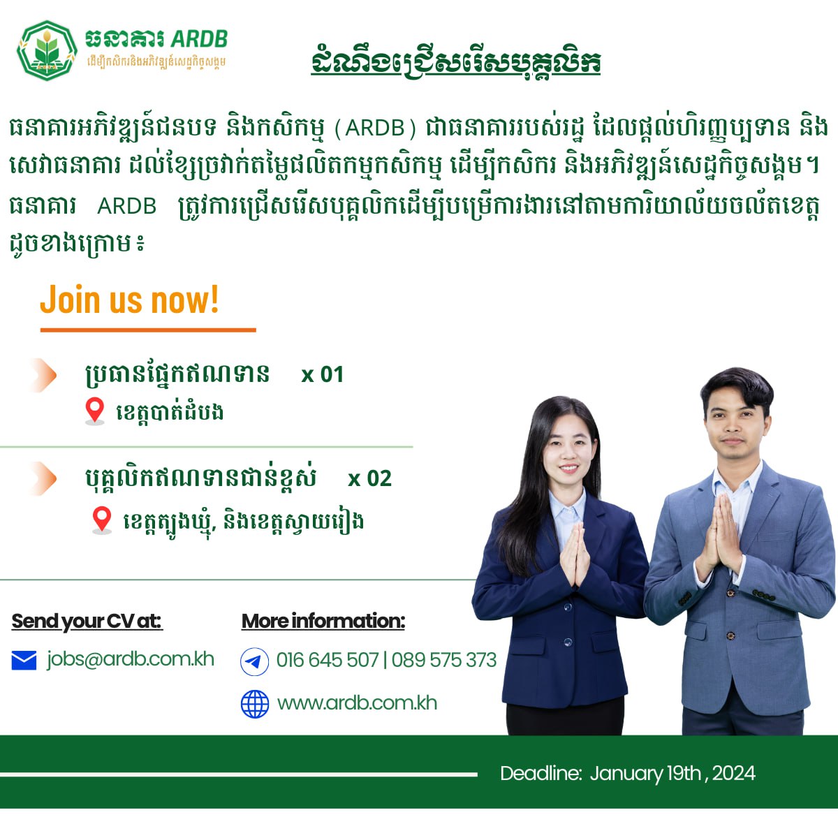 បេក្ខជនដែលមានចំណាប់អារម្មណ៍ សូមផ្ញើ CV មកតាមរយៈ jobs@ardb.com.kh ឬពិនិត្យមើលព័ត៌មានលម្អិត.