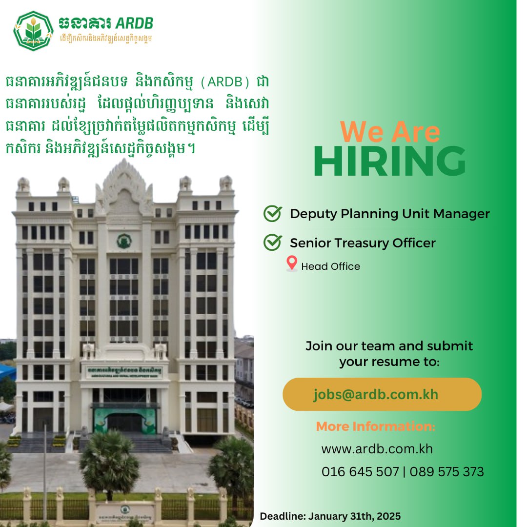 បេក្ខជនដែលមានចំណាប់អារម្មណ៍ សូមផ្ញើ CV មកតាមរយៈ jobs@ardb.com.kh ឬពិនិត្យមើលព័ត៌មានលម្អិត.