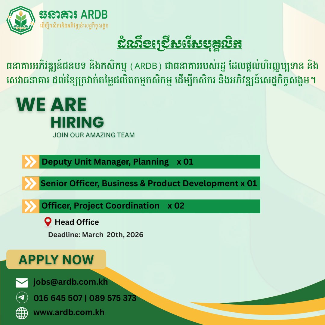 បេក្ខជនដែលមានចំណាប់អារម្មណ៍ សូមផ្ញើ CV មកតាមរយៈ jobs@ardb.com.kh ឬពិនិត្យមើលព័ត៌មានលម្អិត.