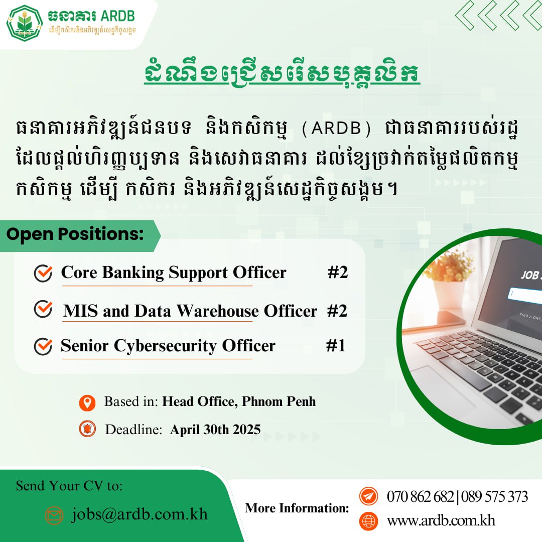 បេក្ខជនដែលមានចំណាប់អារម្មណ៍ សូមផ្ញើ CV មកតាមរយៈ jobs@ardb.com.kh ឬពិនិត្យមើលព័ត៌មានលម្អិត.
