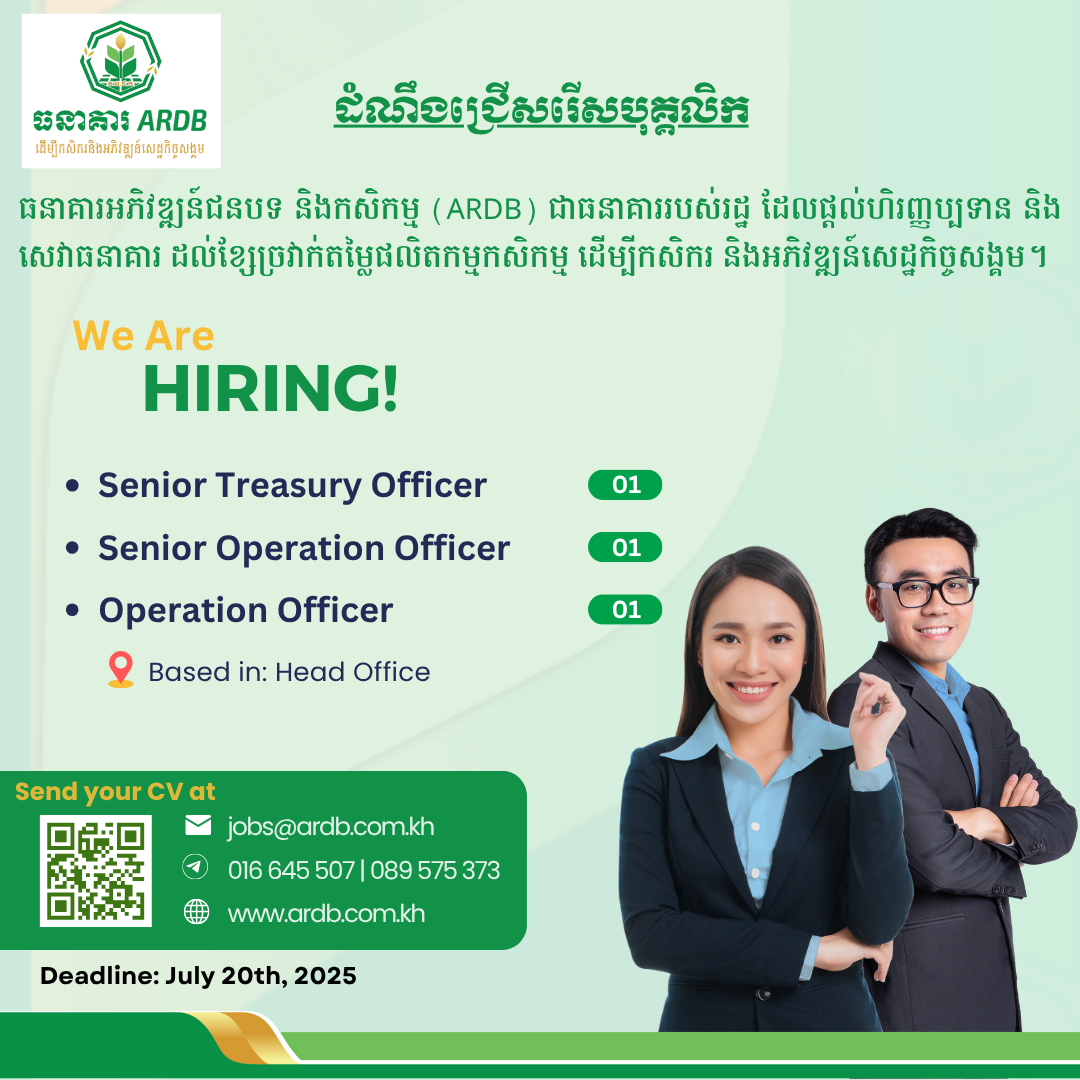 បេក្ខជនដែលមានចំណាប់អារម្មណ៍ សូមផ្ញើ CV មកតាមរយៈ jobs@ardb.com.kh ឬពិនិត្យមើលព័ត៌មានលម្អិត.