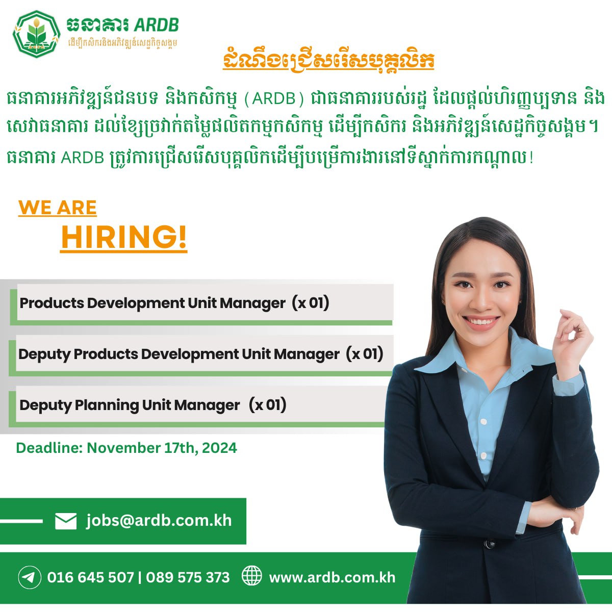 បេក្ខជនដែលមានចំណាប់អារម្មណ៍ សូមផ្ញើ CV មកតាមរយៈ jobs@ardb.com.kh ឬពិនិត្យមើលព័ត៌មានលម្អិត.