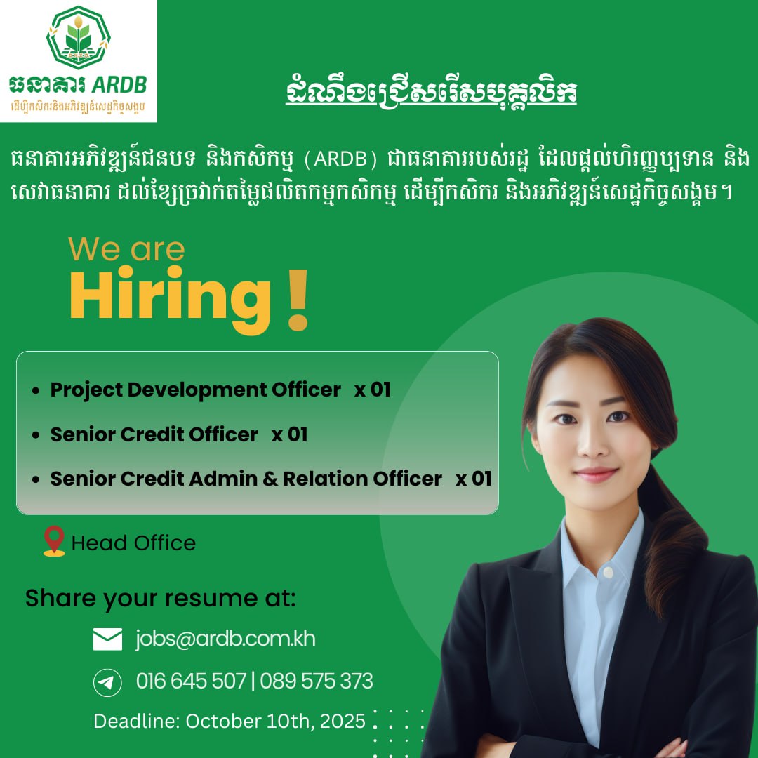 បេក្ខជនដែលមានចំណាប់អារម្មណ៍ សូមផ្ញើ CV មកតាមរយៈ jobs@ardb.com.kh ឬពិនិត្យមើលព័ត៌មានលម្អិត.