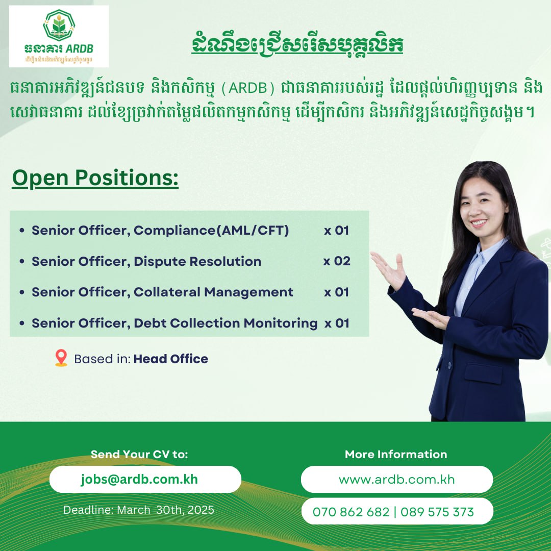 បេក្ខជនដែលមានចំណាប់អារម្មណ៍ សូមផ្ញើ CV មកតាមរយៈ jobs@ardb.com.kh ឬពិនិត្យមើលព័ត៌មានលម្អិត.