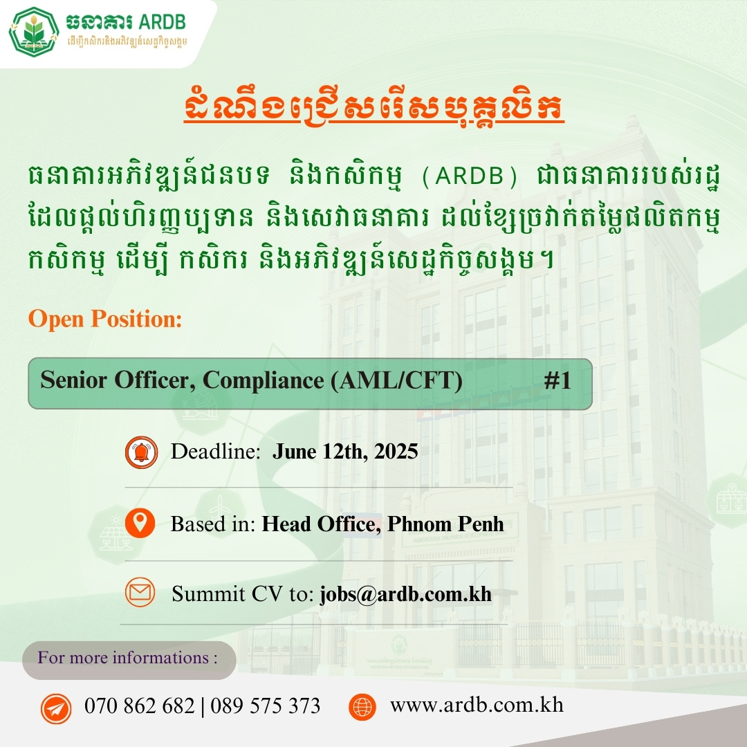 បេក្ខជនដែលមានចំណាប់អារម្មណ៍ សូមផ្ញើ CV មកតាមរយៈ jobs@ardb.com.kh ឬពិនិត្យមើលព័ត៌មានលម្អិត.