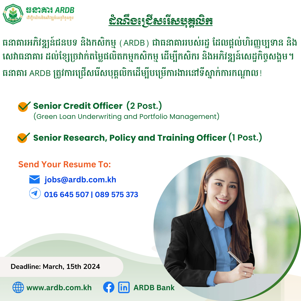 បេក្ខជនដែលមានចំណាប់អារម្មណ៍ សូមផ្ញើ CV មកតាមរយៈ jobs@ardb.com.kh ឬពិនិត្យមើលព័ត៌មានលម្អិត.