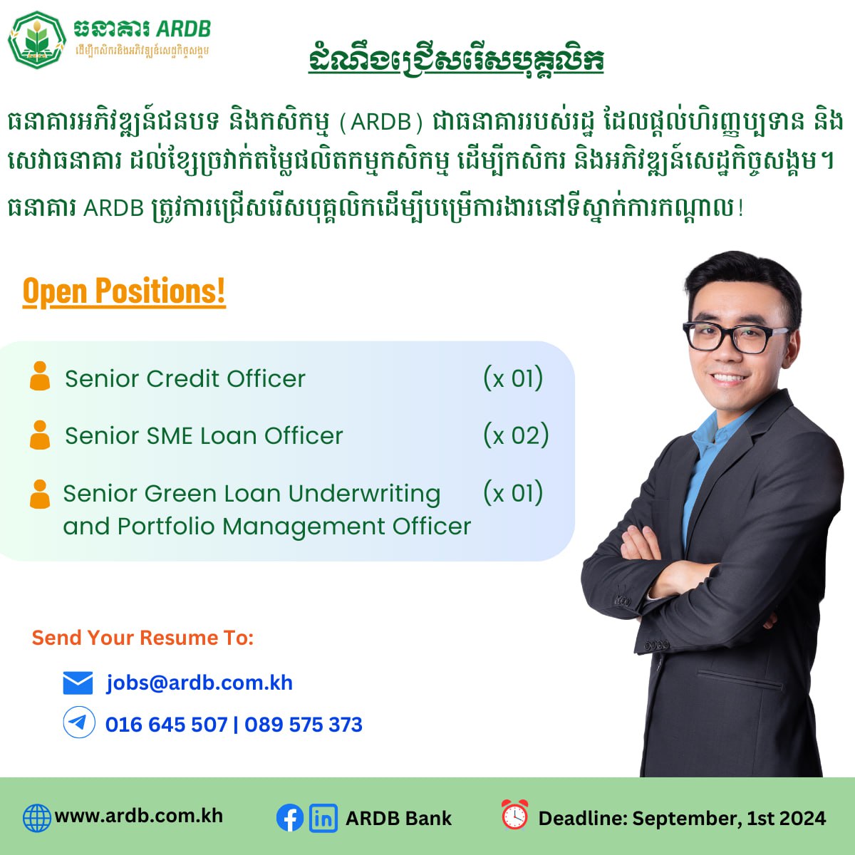 បេក្ខជនដែលមានចំណាប់អារម្មណ៍ សូមផ្ញើ CV មកតាមរយៈ jobs@ardb.com.kh ឬពិនិត្យមើលព័ត៌មានលម្អិត.