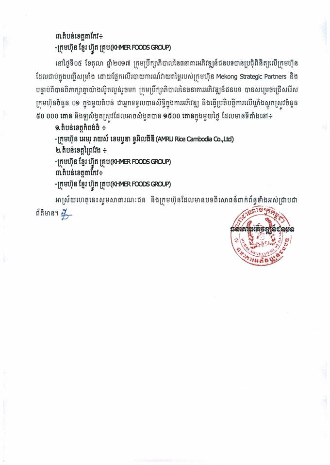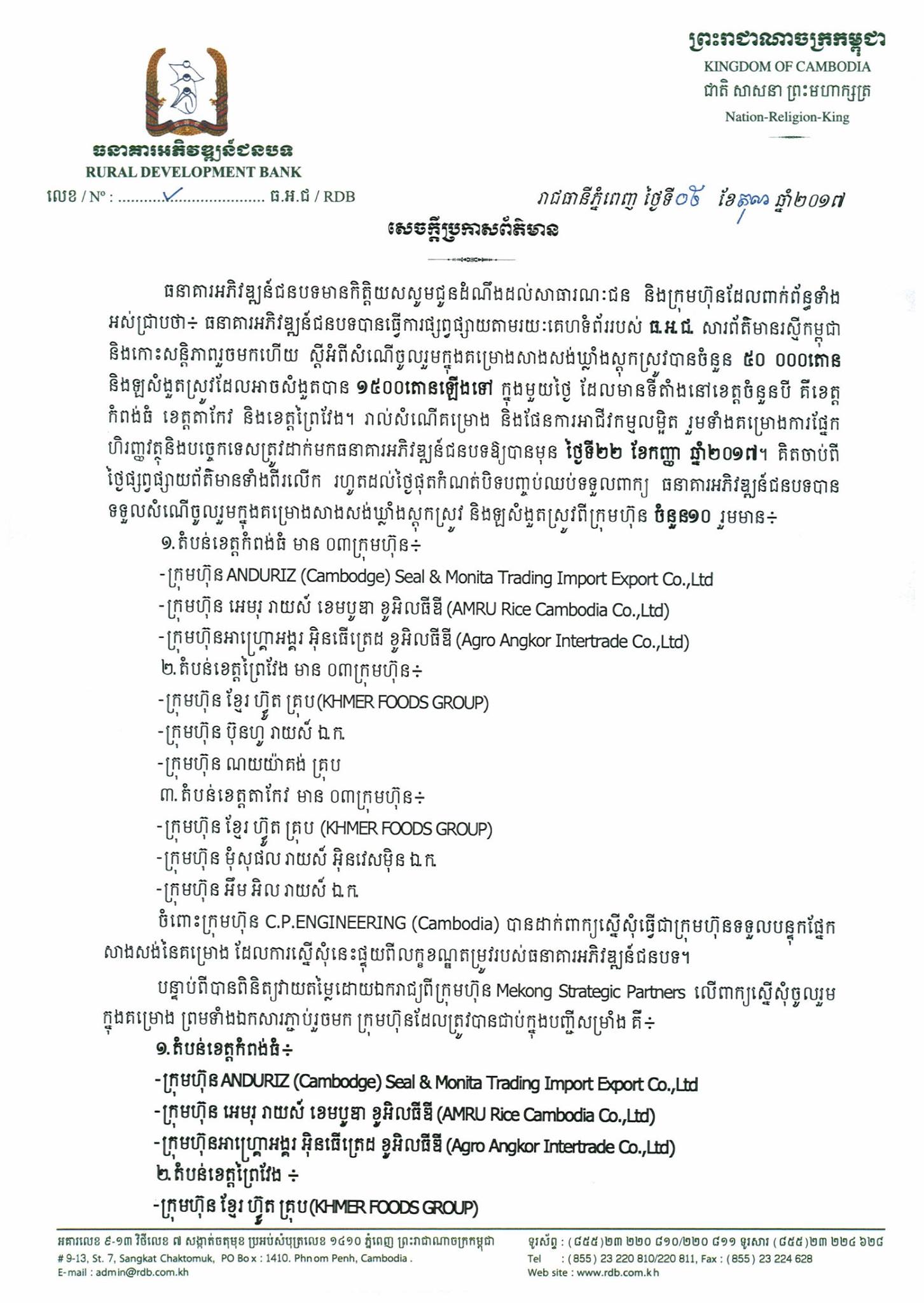 ធនាគារ​អភិវឌ្ឍន៍​ជនបទ៖ នៅថ្ងៃទី០៥ ខែតុលា ឆ្នាំ២០១៧ ក្រុមប្រឹក្សាភិបាលនៃធនាគារអភិវឌ្ឍន៍ជនបទបានប្រជុំពិនិត្យលើក្រុមហ៊ុន ដែលជាប់ក្នុងបញ្ជីសម្រាំង ដោយផ្អែកលើរបាយការណ៍វាយតម្លៃរបស់ក្រុមហ៊ុន Mekong Strategic Partners និង បន្ទាប់ពីបានពិភាក្សាគ្នាយ៉ាងល្អិតល្អន់រួចមក ក្រុមប្រឹក្សាភិបាលនៃធនាគារអភិវឌ្ឍន៍ជនបទ បានសម្រេចជ្រើសរើស ក្រុមហ៊ុនចំនួន ០១ ក្នុងមួយតំបន់ ជាអ្នកទទួលបានសិទ្ធិក្នុងការអភិវឌ្ឍ និងធ្វើប្រតិបត្តិការលើឃ្លាំងស្តុកស្រូវចំនួន ៥០ ០០០ តោន និងឡសំងួតស្រូវដែលអាចសំងួតបាន ១៥០០ តោនក្នុងមួយថ្ងៃ ដែលមានទីតាំងនៅ៖