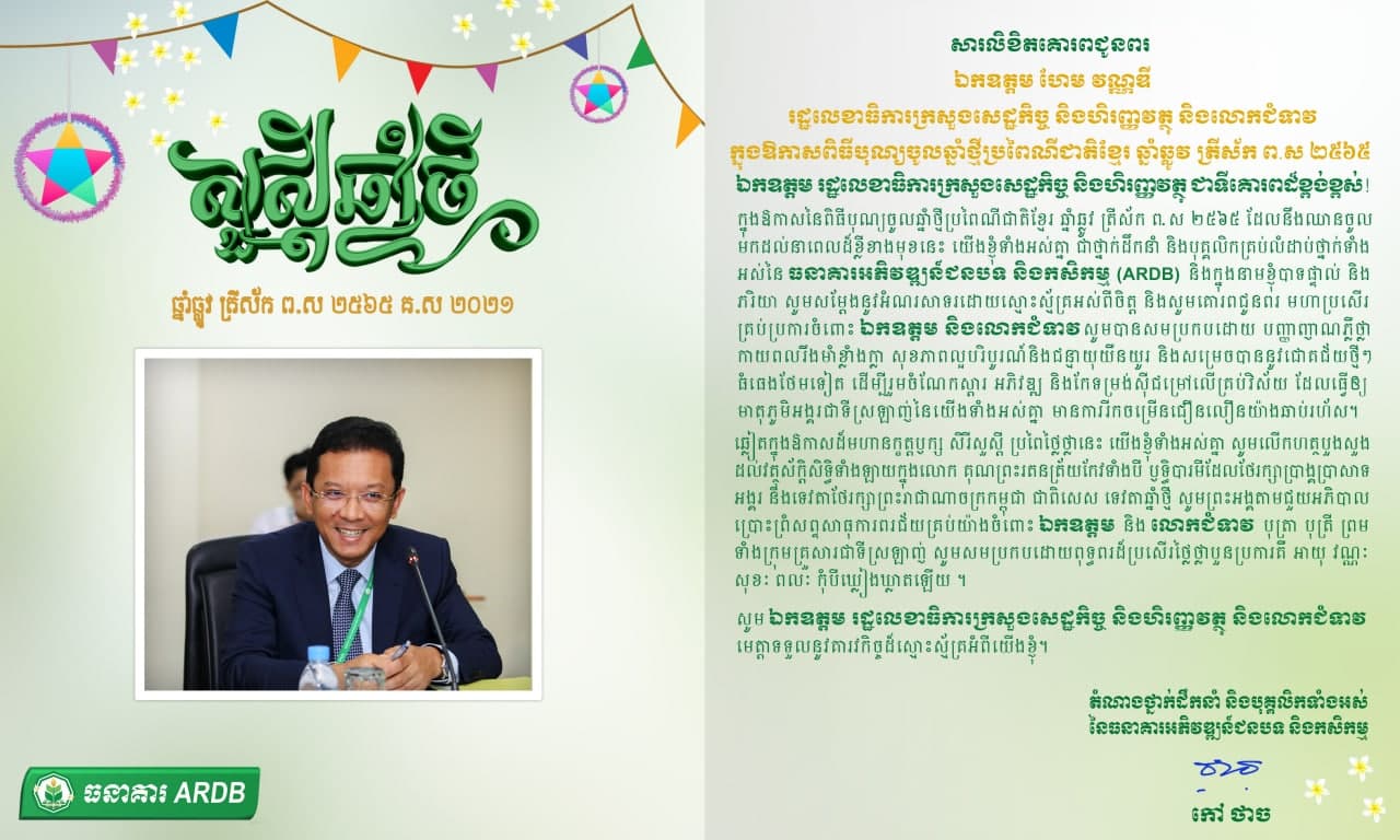 14 មេសា 2021 សារលិខិតគោរពជូនពរ ឯកឧត្តម ហែម វណ្ណឌី រដ្ឋលេខាធិការក្រសួងសេដ្ឋកិច្ច និងហិរញ្ញវត្ថុ និងលោកជំទាវ ក្នុងឱកាសពិធីបុណ្យចូលឆ្នាំថ្មី ប្រពៃណីជាតិខ្មែរ ឆ្នាំឆ្លូវ ត្រីស័ក ព.ស ២៥៦៥ Post navigation Previous សារលិខិតគោរពជូនពរ ឯកឧត្តម សួង ម៉េងគា រដ្ឋលេខាធិការក្រសួងសេដ្ឋកិច្ច និងហិរញ្ញវត្ថុ និងលោកជំទាវ ក្នុងឱកាសពិធីបុណ្យចូលឆ្នាំថ្មី ប្រពៃណីជាតិខ្មែរ ឆ្នាំឆ្លូវ ត្រីស័ក ព.ស ២៥៦៥Next សារលិខិតគោរពជូនពរ លោក ជំទាវ កែវ ចរិយា រដ្ឋលេខាធិការក្រសួងសេដ្ឋកិច្ច និងហិរញ្ញវត្ថុ ក្នុងឱកាសពិធីបុណ្យចូលឆ្នាំថ្មី ប្រពៃណីជាតិខ្មែរ ឆ្នាំឆ្លូវ ត្រីស័ក ព.ស ២៥៦៥