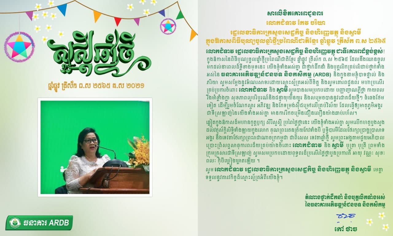 3. សារលិខិតគោរពជូនពរ​ លោក ជំទាវ កែវ ចរិយា រដ្ឋលេខាធិការក្រសួងសេដ្ឋកិច្ច និងហិរញ្ញវត្ថុ ក្នុងឱកាសពិធីបុណ្យចូលឆ្នាំថ្មី ប្រពៃណីជាតិខ្មែរ ឆ្នាំឆ្លូវ ត្រីស័ក ព.ស ២៥៦៥
