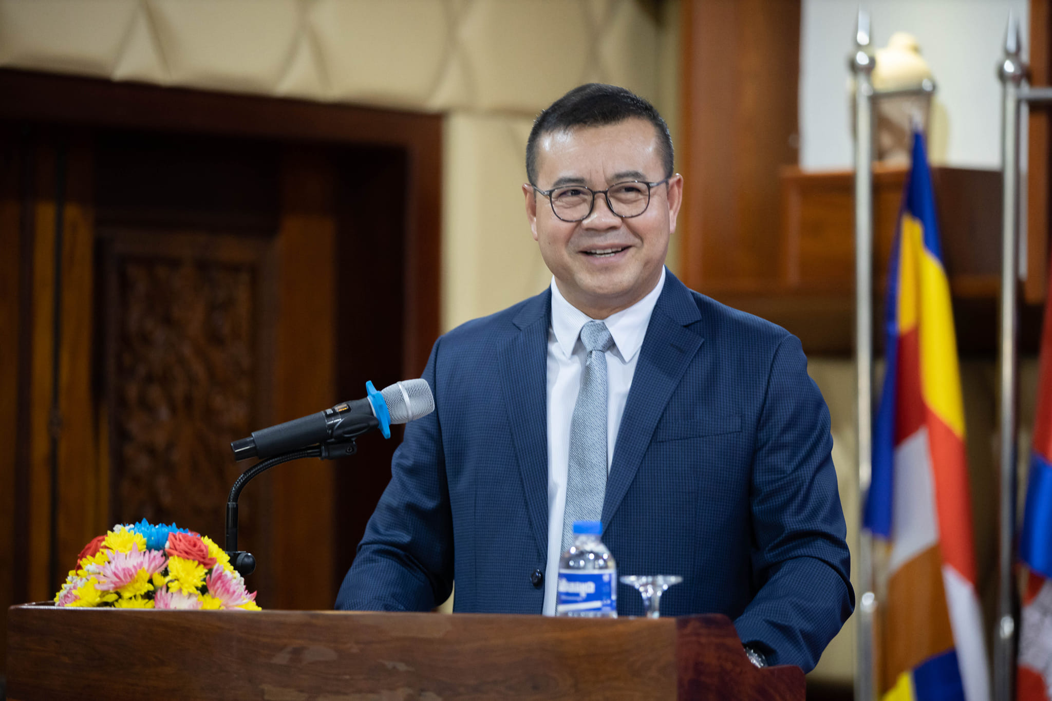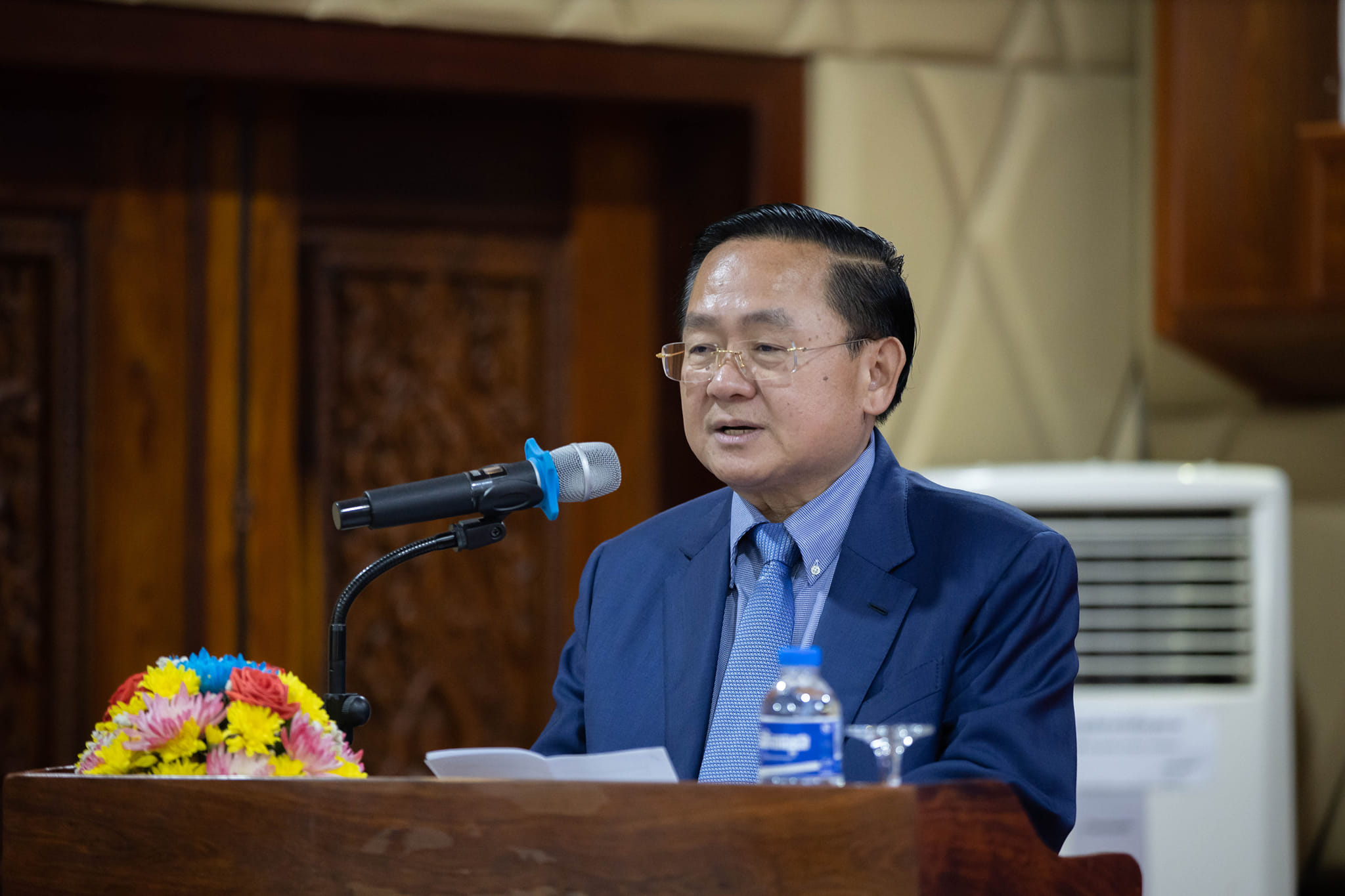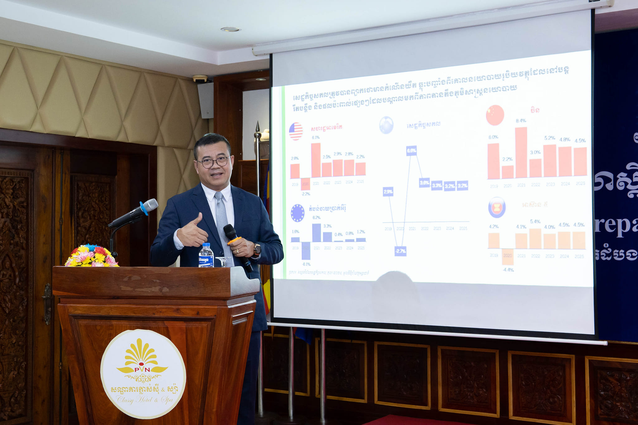បន្ទាប់មក ឯកឧត្តមបណ្ឌិតក៏បានធ្វើបទបង្ហាញពីទស្សនវិស័យសេដ្ឋកិច្ចសកល ដែលកំពុងតែមានភាពមិនច្បាស់លាស់ ក្រោយវិបត្តិកូវីដ ១៩ គឺ បង្កឡើងដោយសារតែភាពតានតឹងនៃសង្រ្គាមពាណិជ្ជកម្មរវាង ចិន និងសហរដ្ឋអាមរិក ការរឹតបន្តឹងនៃគោលនយោបាយហិរញ្ញវត្ថពិភពលោក ព្រមទាំងបានលើកឡើងពីទស្សនវិស័យសេដ្ឋកិច្ចកម្ពុជាឆ្នាំ២០២៥ ជាមួយកំណើន៦,៣%។