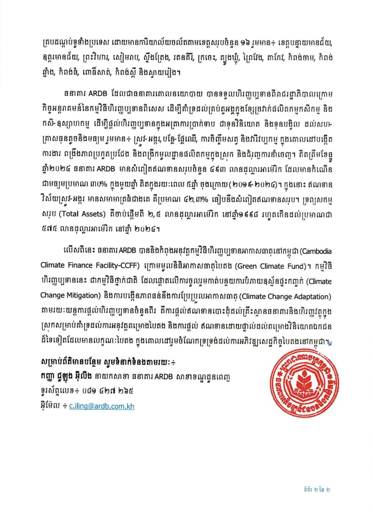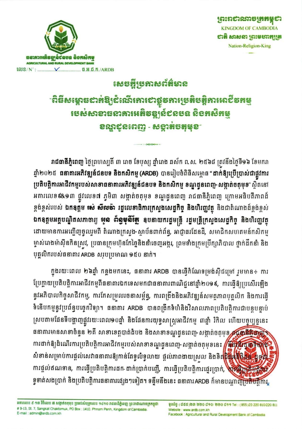 សេចក្តីប្រកាសព័ត៌មាន “ពិធីសម្ពោធដាក់ឱ្យដំណើរការជាផ្លូវការប្រតិបត្តិការអាជីវកម្ម របស់សាខាធនាគារអភិវឌ្ឍន៍ជនបទ និងកសិកម្ម ខណ្ឌដូនពេញ - សង្កាត់ចតុមុខ”