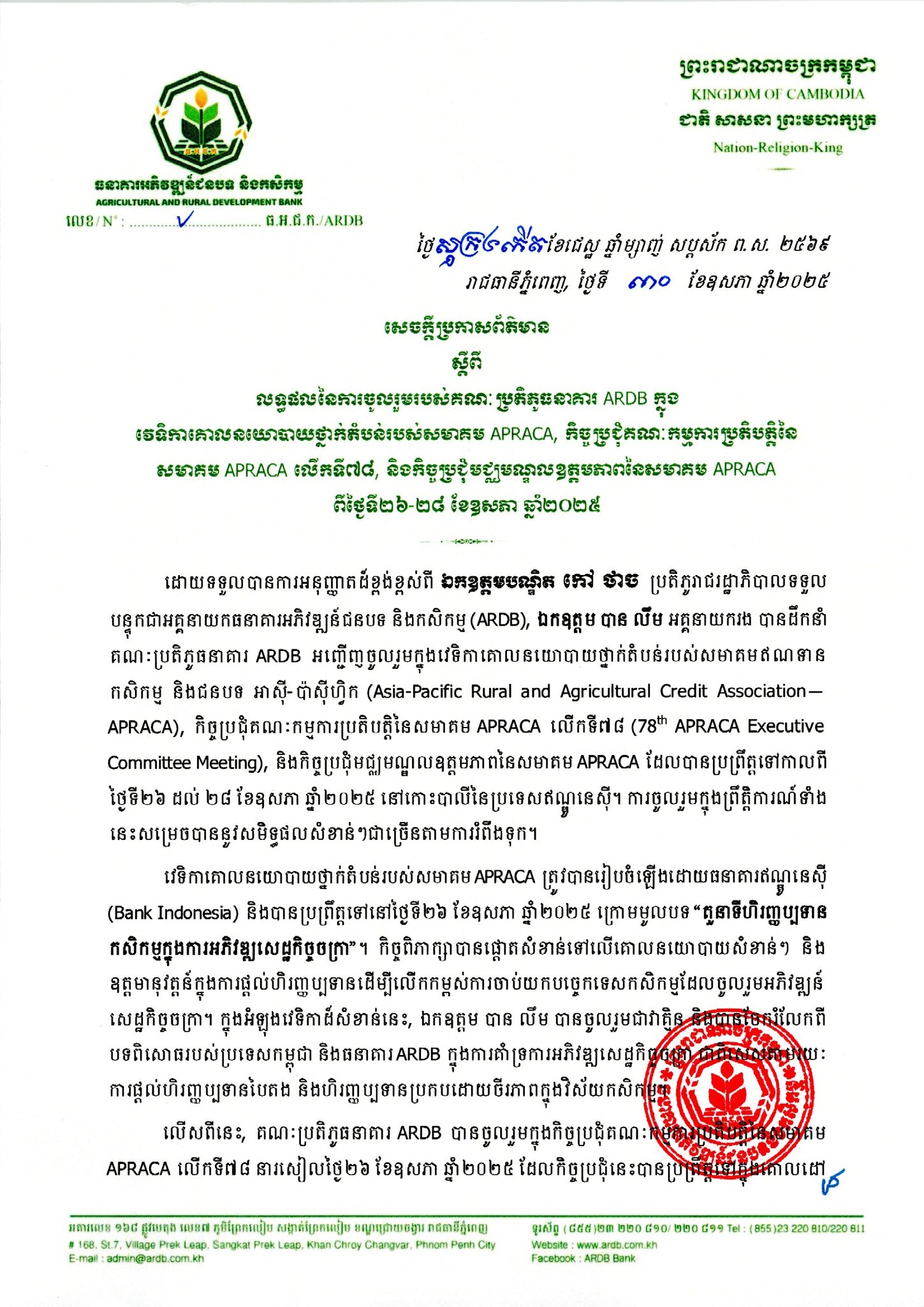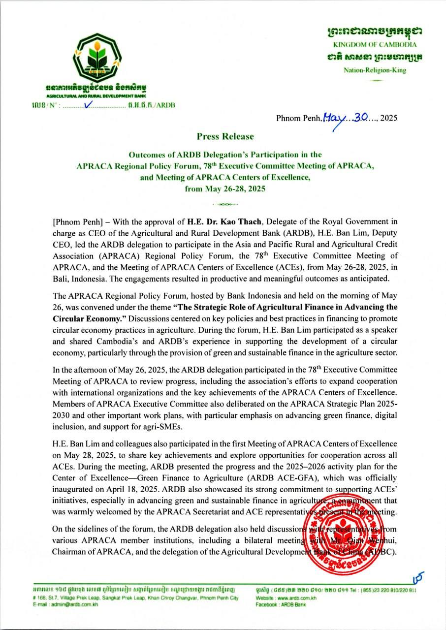 ភ្នំពេញ៖ ដោយទទួលបានការអនុញ្ញាតដ៏ខ្ពង់ខ្ពស់ពី ឯកឧត្តមបណ្ឌិត កៅ ថាច ប្រតិភូរាជរដ្ឋាភិបាលទទួលបន្ទុកជាអគ្គនាយកធនាគារអភិវឌ្ឍន៍ជនបទ និងកសិកម្ម (ARDB), ឯកឧត្តម បាន លឹម អគ្គនាយករង អមដោយប្រតិភូធនាគារ ARDB បានអញ្ជើញចូលរួមក្នុងវេទិកាគោលនយោបាយថ្នាក់តំបន់របស់សមាគមឥណទានកសិកម្ម និងជនបទ អាស៊ី-ប៉ាស៊ីហ្វិក (APRACA Regional Policy Forum), កិច្ចប្រជុំគណៈកម្មការប្រតិបត្តិនៃសមាគម APRACA លើកទី៧៨ (78th APRACA Executive Committee Meeting), និងកិច្ចប្រជុំមជ្ឈមណ្ឌលឧត្តមភាពនៃសមាគម APRACA (Meeting of APRACA Centers of Excellence—ACE) ដែលប្រព្រឹត្តទៅចាប់ពីថ្ងៃទី២៦ ដល់ថ្ងៃទី២៨ ខែឧសភា ឆ្នាំ២០២៥ កន្លងទៅនេះនៅកោះបាលីនៃប្រទេសឥណ្ឌូនេស៊ី។