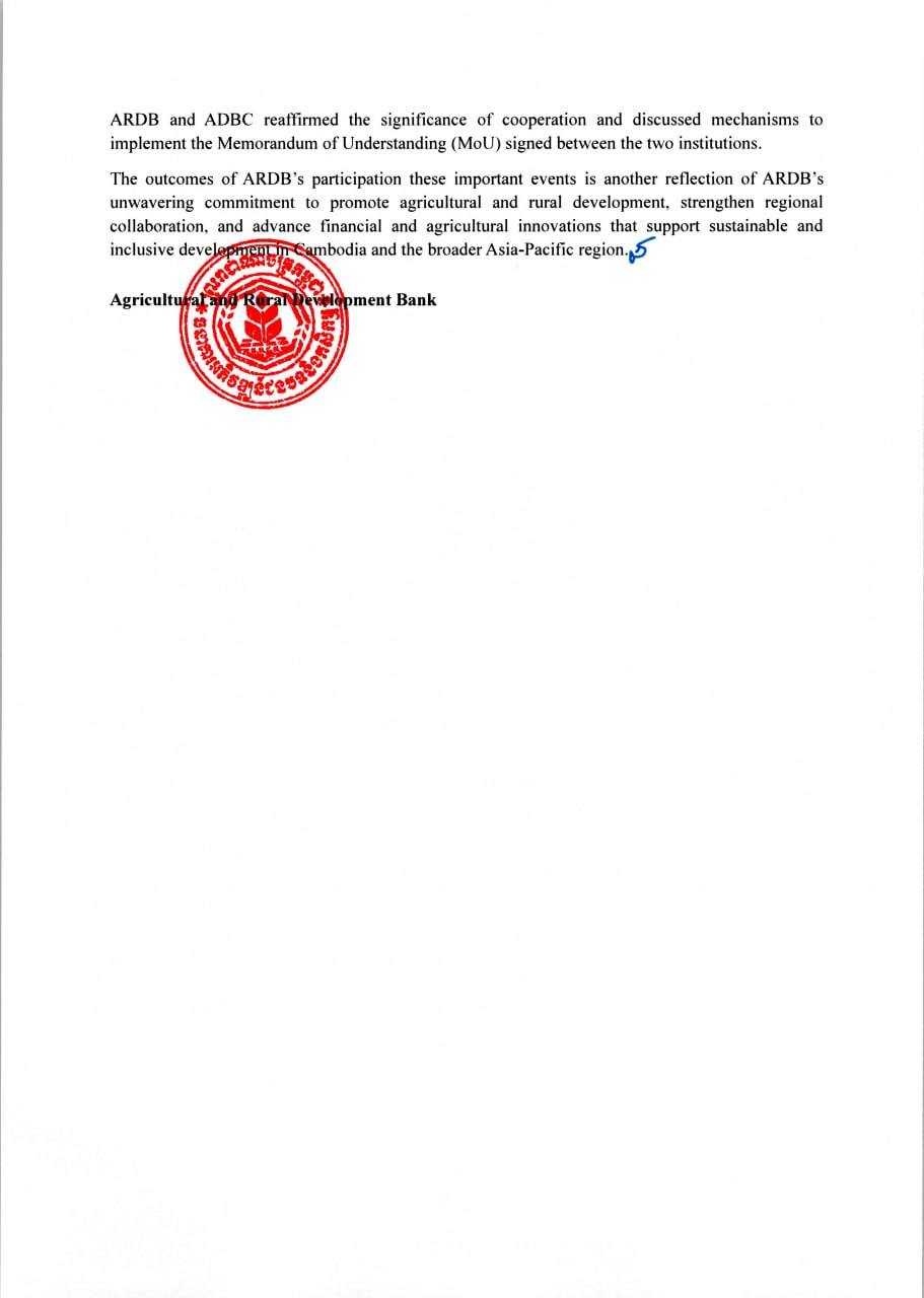 ការចូលរួមក្នុងព្រឹត្តិការណ៍ថ្នាក់តំបន់ទាំងនេះបាននាំមកនូវសមិទ្ធផលសំខាន់ៗជាច្រើន និងបានឆ្លុះបញ្ចាំងសារជាថ្មីពីឆន្ទៈដ៏មោះមុតរបស់ធនាគារ ARDB ក្នុងការលើកកម្ពស់ការអភិវឌ្ឍវិស័យកសិកម្ម និងសេដ្ឋកិច្ចជនបទ ព្រមទាំងចូលរួមក្នុងកិច្ចខិតខំប្រឹងប្រែងរបស់ធនាគារក្នុងការពង្រឹងកិច្ចសហប្រតិបត្តិការក្នុងតំបន់ និងជំរុញដល់ការធ្វើនវានុវត្តក្នុងវិស័យហិរញ្ញវត្ថុ និងវិស័យកសិកម្ម ដែលគាំទ្រការអភិវឌ្ឍប្រកបដោយចីរភាព និងបរិយាបន្នទាំងនៅប្រទេសកម្ពុជា និងក្នុងតំបន់អាស៊ី-ប៉ាស៊ីហ្វិក។