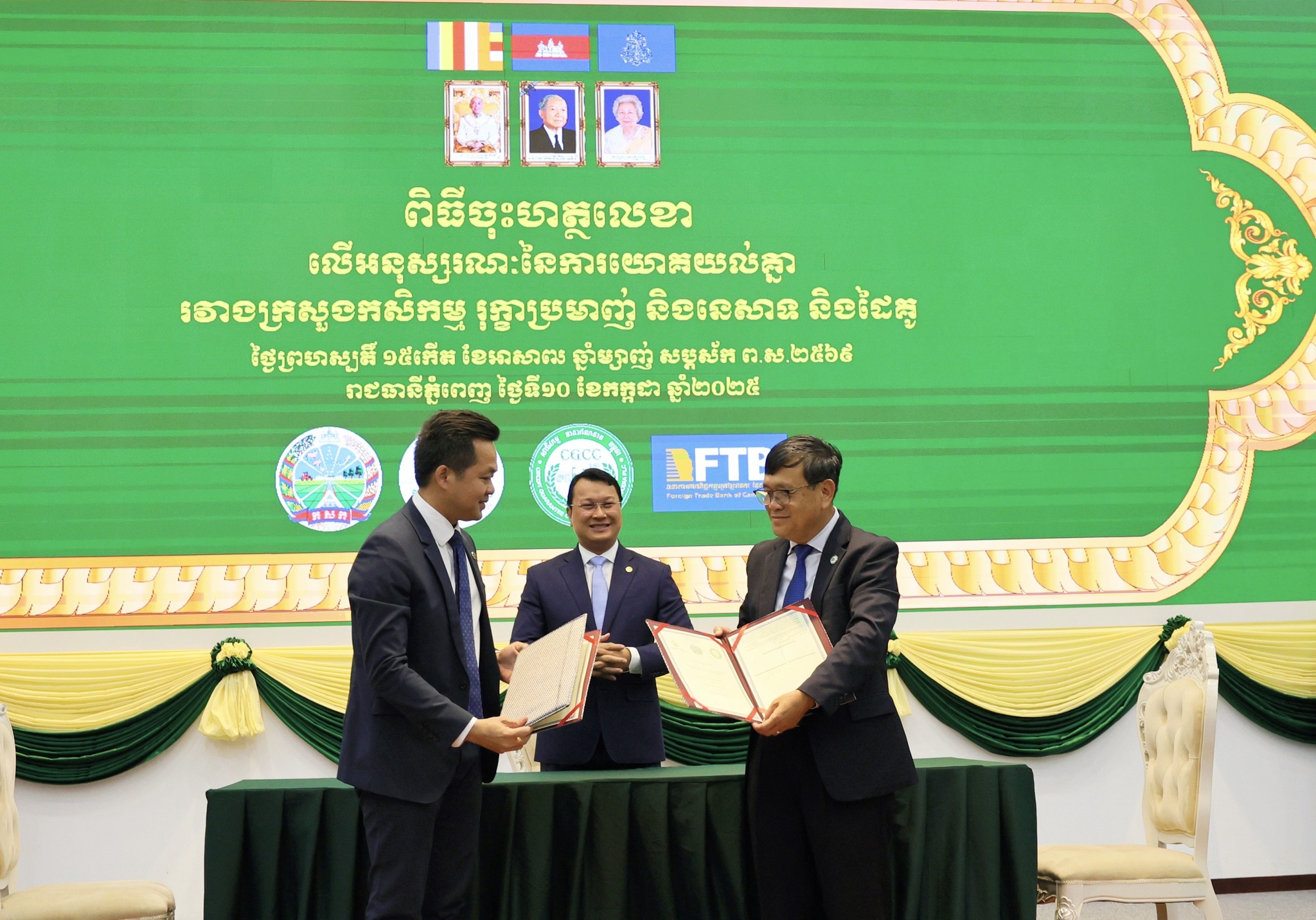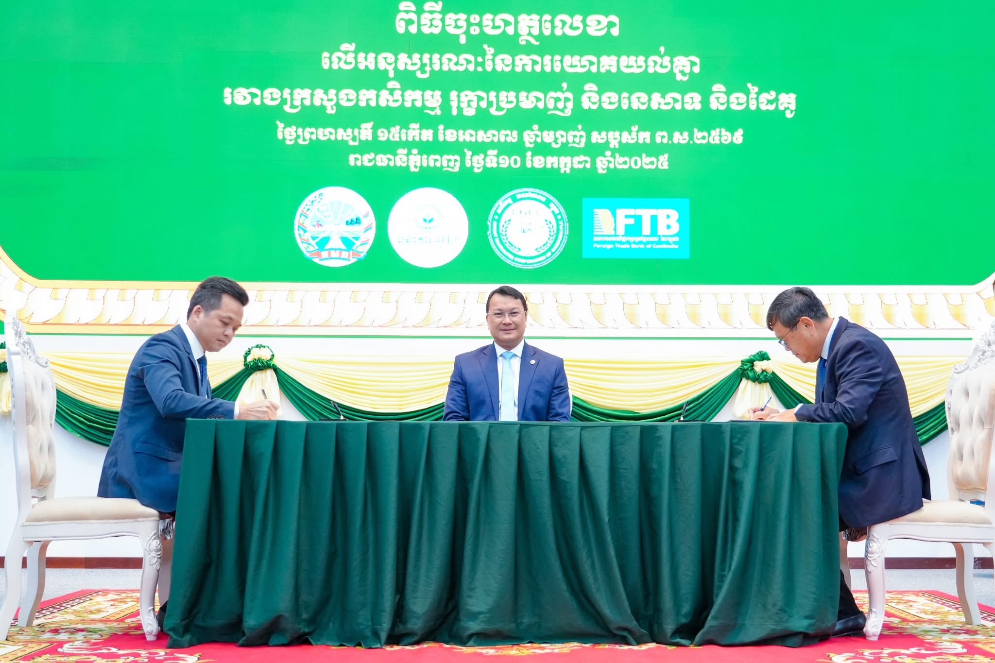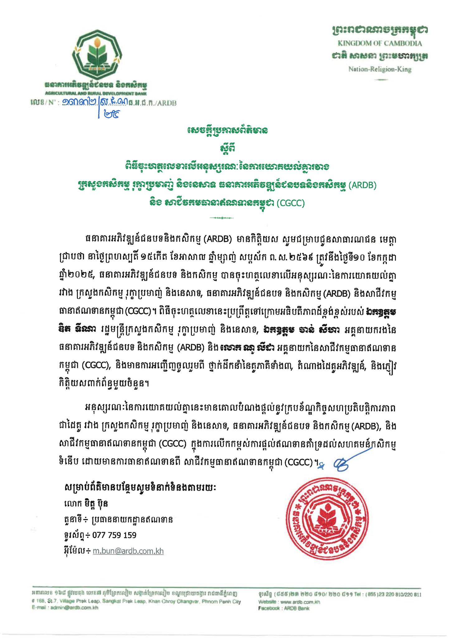 រាជធានីភ្នំពេញ៖ នៅទីស្តីការក្រសួងកសិកម្ម រុក្ខាប្រមាញ់ និងនេសាទ, នារសៀលថ្ងៃព្រហស្បតិ៍ ទី១០ ខែកក្កដា ឆ្នាំ២០២៥, ដោយទទួលបានការអនុញ្ញាតដ៏ខ្ពង់ខ្ពស់ពីឯកឧត្តមបណ្ឌិត កៅ ថាច ប្រតិភូរាជរដ្ឋាភិបាលទទួលបន្ទុកជាអគ្គនាយកធនាគារអភិវឌ្ឍន៍ជន និងកសិកម្ម (ARDB), ឯកឧត្តម ចាន់ សីហា អគ្គនាយករង និងសហការី បានអញ្ជើញចូលរួមក្នុងពិធីចុះអនុស្សរណៈនៃការយោគយល់គ្នា (MOU) រវាងក្រសួងកសិកម្ម រុក្ខាប្រមាញ់ និងនេសាទ, ធនាគារអភិវឌ្ឍន៍ជនបទ និងកសិកម្ម (ARDB), និងសាជីវកម្មធានាឥណទានកម្ពុជា (CGCC) ក្រោមអធិបតីដ៏ខ្ពង់ខ្ពស់ ឯកឧត្តម ឌិត ទីណា រដ្ឋមន្ត្រីក្រសួងកសិកម្ម រុក្ខាប្រមាញ់ និងនេសាទ និងមានការចូលរួមពី រដ្ឋលេខាធិការ, អនុរដ្ឋលេខាធិការ, អគ្គនាយកសាជីវកម្មឥណទានកម្ពុជា, ថ្នាក់ដឹកនាំជាន់ខ្ពស់ធនាគារពាណិជ្ជកម្មក្រៅប្រទេសនៃកម្ពុជា, ព្រមទាំងថ្នាក់ដឹកជាច្រើនរូបទៀតផងដែរ។