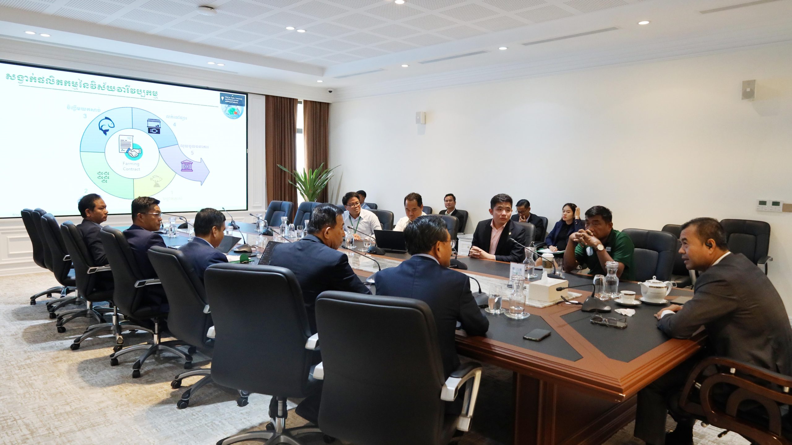 រាជធានីភ្នំពេញ៖ ឯកឧត្តមបណ្ឌិត កៅ ថាច ប្រតិភូរាជរដ្ឋាភិបាលទទួលបន្ទុកជាអគ្គនាយកធនាគារអភិវឌ្ឍន៍ជនបទ និងកសិកម្ម (ARDB) រួមទាំងសហការី បានអនុញ្ញាតឱ្យក្រុមការងារនៃ ផេនហ្គាខ្វា (PangAqua Group) ដែលជាអ្នកផ្គត់ផ្គង់ធាតុចូលវារីវប្បកម្ម (ការចិញ្ចឹមត្រី) បច្ចេកទេសវារីវប្បកម្ម និងជាអ្នកប្រមូលទិញ ជួបពិភាក្សាការងារអំពីក្រុម PangAqua Group, ខ្សែច្រវាក់ផលិតកម្មនៃវិស័យវារីវប្បកម្ម, កិច្ចសន្យាកសិកម្មរវាង PangAqua Group និងអ្នកធ្វើវារីវប្បកម្ម និងយន្តការនៃការផ្តល់ឥណទាន (ត្រីភាគី) ក្នុងគោលបំណងដើម្បីពង្រឹង និងពង្រីកខ្សែច្រវាក់ផលិតកម្មនៃវិស័យវារីវប្បកម្ម ប្រកបដោយនិរន្តរភាពស្របតាមកំណើននៃតម្រូវការទីផ្សារ ក៏ដូចជារួមចំណែកបង្កើនផលចំណូលជូនបងប្អូនអ្នកធ្វើវារីវប្បកម្មនៅទីជនបទ។
