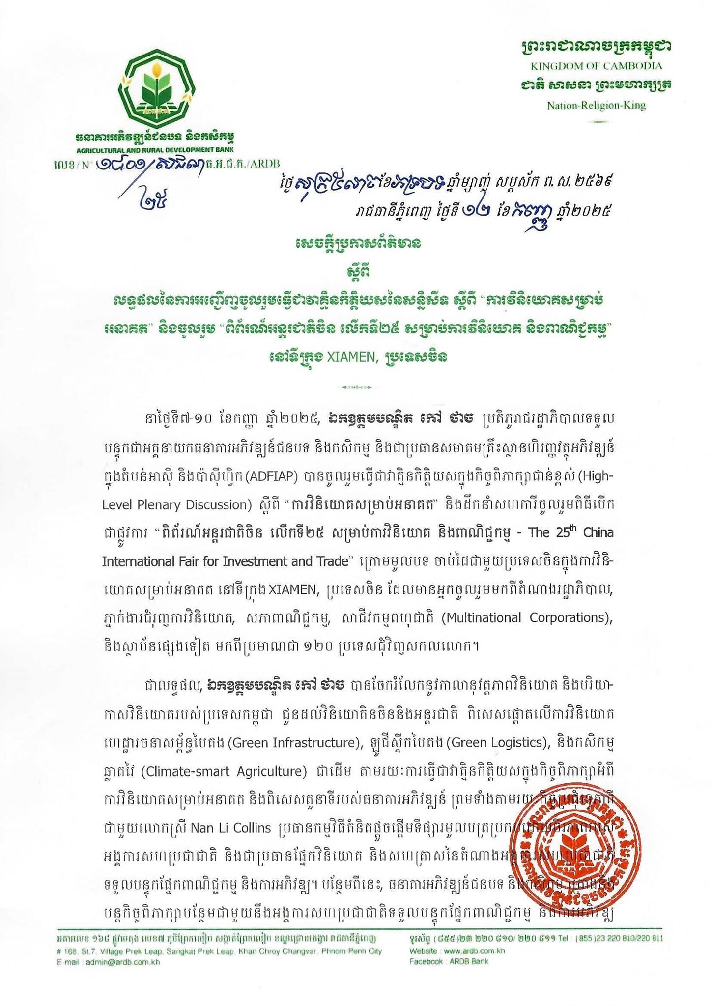 សេចក្តីប្រកាសព័ត៌មាន ស្តីពី លទ្ធផលនៃការអញ្ជើញចូលរួមជាវាគ្មិនកិត្តិយសនៃសន្និសីទ ស្តីពី "ការវិនិយោគសម្រាប់អនាគត" និងចូលរួម "ពិព័ណ៍អន្តរជាតិចិន លើកទី២៥ សម្រាប់ការវិនិយោគ និងពាណិជ្ជកម្ម" នៅទីក្រុង XIAMEN ប្រទេសចិន