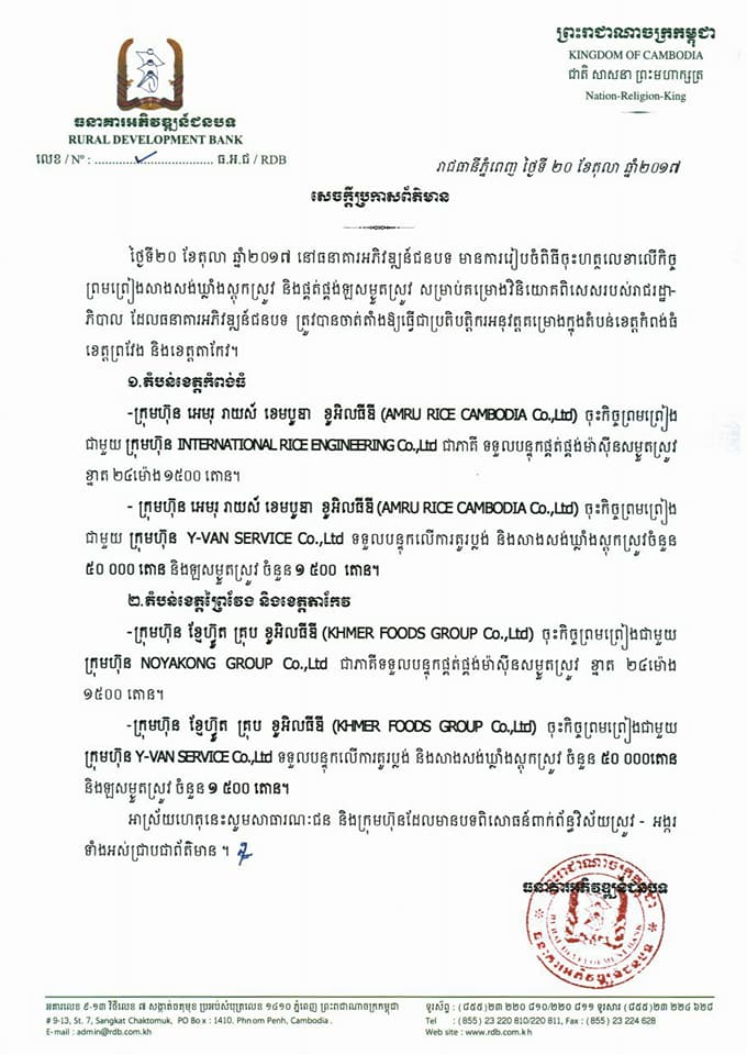ធនាគារអភិវឌ្ឍន៍ជនបទ ថ្ងៃទី២០ ខែតុលា ឆ្នាំ២០១៧ សេចក្តីប្រកាសព័ត៍មានស្តីពីការចុះកិច្ចព្រមព្រៀងសាងសង់ឃ្លាំងស្តុកស្រូវ និងផ្គត់ផ្គង់ឡសម្ងួតស្រូវសម្រាប់គម្រោងវិនិយោគពិសេសរបស់រាជរដ្ឋាបាល នៅតំបន់ខេត្តកំពង់ធំ ព្រៃវៃង និងតាកែវ: