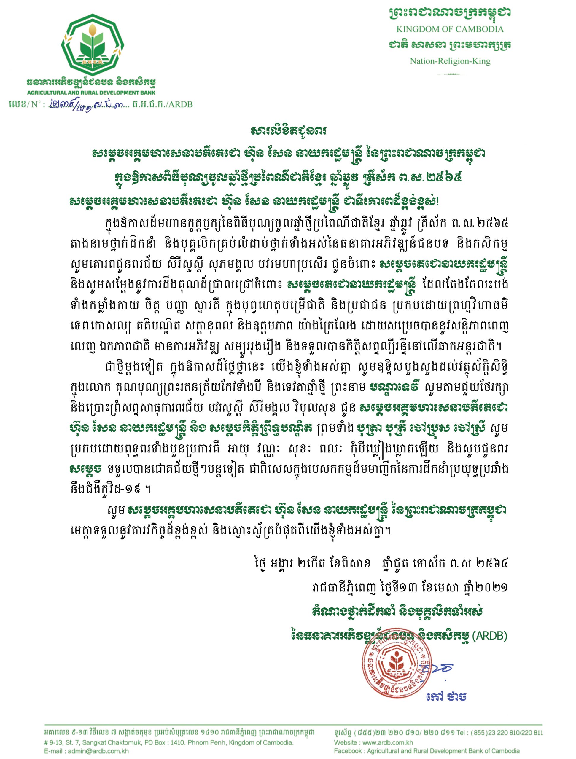 13 មេសា 2021 សារលិខិតជូនពរ សម្តេចអគ្គមហាសេនាបតីតេជោ ហ៊ុន សែន នាយករដ្ឋមន្ត្រី នៃព្រះរាជាណាចក្រកម្ពុជាក្នុងឱកាសពិធីបុណ្យចូលឆ្នាំថ្មី ប្រពៃណីជាតិខ្មែរ ឆ្នាំឆ្លូវ ត្រីស័ក ព.ស ២៥៦៥ Post navigation Previous សារលិខិតជូនពរ ឯកឧត្តមអគ្គបណ្ឌិតសភាចារ្យ អូន ព័ន្ធមុន្នីរ័ត្ន ឧបនាយករដ្ឋមន្ត្រី រដ្ឋមន្ត្រីក្រសួងសេដ្ឋកិច្ច និងហិរញ្ញវត្ថុ និងលោកជំទាវព្រមទំាងគ្រួសារ ក្នុងឱកាសពិធីបុណ្យចូលឆ្នាំថ្មី ប្រពៃណីជាតិខ្មែរ ឆ្នាំឆ្លូវ ត្រីស័ក ព.ស ២៥៦៥Next សារលិខិតគោរពជូនពរ ឯកឧត្តម វង្សី វិស្សុត រដ្ឋមន្ត្រីប្រតិភូអមនាយករដ្ឋមន្ត្រី រដ្ឋលេខាធិការប្រចំាការក្រសួងសេដ្ឋកិច្ច និងហិរញ្ញវត្ថុ និងលោកជំទាវ ក្នុងឱកាសពិធីបុណ្យចូលឆ្នាំថ្មី ប្រពៃណីជាតិខ្មែរ ឆ្នាំឆ្លូវ ត្រីស័ក ព.ស ២៥៦៥