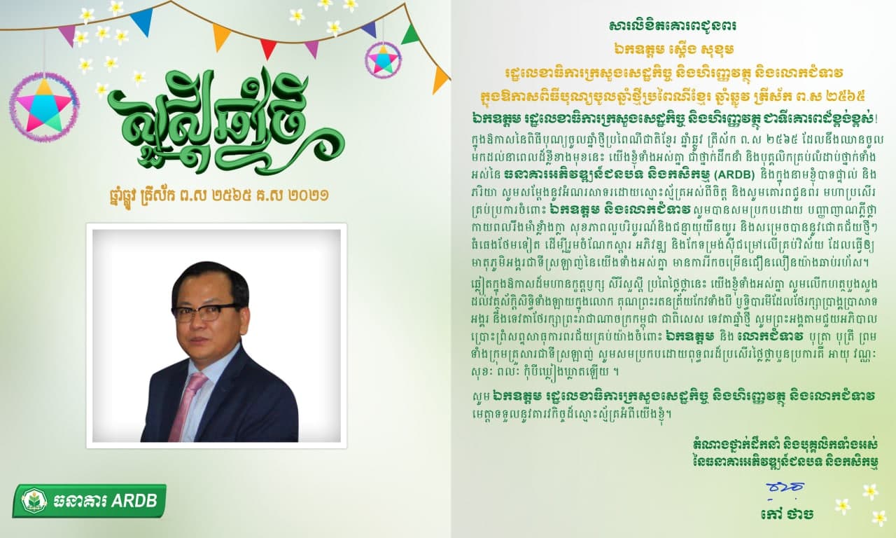 13 April 2021 សារលិខិតគោរពជូនពរ ឯកឧត្តម ស្តើង សុខុម រដ្ឋលេខាធិការក្រសួងសេដ្ឋកិច្ច និងហិរញ្ញវត្ថុ និងលោកជំទាវ ក្នុងឱកាសពិធីបុណ្យចូលឆ្នាំថ្មី ប្រពៃណីជាតិខ្មែរ ឆ្នាំឆ្លូវ ត្រីស័ក ព.ស ២៥៦៥ Post navigation Previous សារលិខិតគោរពជូនពរ ឯកឧត្តម ជូ គីមទ្បេង រដ្ឋលេខាធិការក្រសួងសេដ្ឋកិច្ច និងហិរញ្ញវត្ថុ និងលោកជំទាវ ក្នុងឱកាសពិធីបុណ្យចូលឆ្នាំថ្មី ប្រពៃណីជាតិខ្មែរ ឆ្នាំឆ្លូវ ត្រីស័ក ព.ស ២៥៦៥Next សារលិខិតគោរពជូនពរ ឯកឧត្តម ញាណ ទ្បេង រដ្ឋលេខាធិការក្រសួងសេដ្ឋកិច្ច និងហិរញ្ញវត្ថុ និងលោកជំទាវ ក្នុងឱកាសពិធីបុណ្យចូលឆ្នាំថ្មី ប្រពៃណីជាតិខ្មែរ ឆ្នាំឆ្លូវ ត្រីស័ក ព.ស ២៥៦៥
