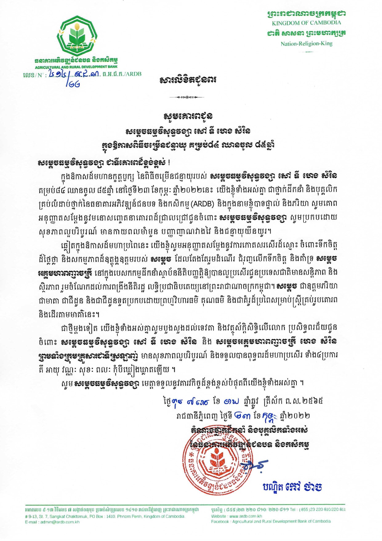 24 February 2022 សារជូនពរសម្តេចធម្មវិសុទ្ធវង្សា សៅ ទី ហេង សំរិន ក្នុងចម្រើនជន្មាយុ គម្រប់ ៨៤ ឈានចូល ៨៥ឆ្នាំ Post navigation Previous Dear our value ARDB customers please enjoy using ARDB Mobile banking app by simply opening a savings accountNext Mr. Ban Lim, Deputy Chief Executive Officer of the ARDB accompanied by colleagues has celebrated the online signing ceremony on Scope of Work and Master Agreement between ARDB, First Cambodia Co.,Ltd, and BPC company