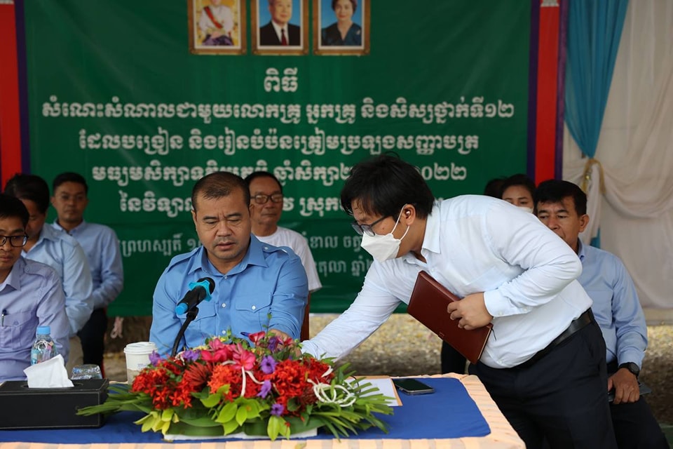 ចុងបញ្ចប់នៃកិច្ចសំណេះសំណាលដើម្បីជាការលើកទឹកចិត្ត និងថ្លែងអំណរគុណដល់កិច្ចខិតខំប្រឹងប្រែងរបស់លោកគ្រូ អ្នកគ្រូ ឯកឧត្តមបណ្ឌិត កៅ ថាច បាននាំយកថវិកាដ៏ថ្លែថ្លារបស់ឯកឧត្តមអគ្គបណ្ឌិតសភាចារ្យ អូន ព័ន្ធមុនីរ័ត្ន ដើម្បីឧបត្ថម្ភដល់លោកគ្រូ អ្នកគ្រូ ដែលបានចំណាយពេលបង្រៀនបំប៉ន សិស្សថ្នាក់ទី១២ ដើម្បីត្រៀមប្រឡងបាក់ឌុបនាពេលខាងមុខ៖