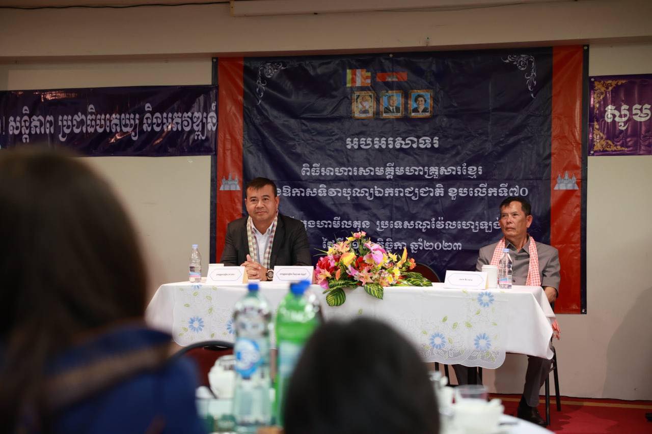 ទីក្រុងហាមិលតុន ប្រទេសណូវ៉ែលហ្សេឡង់៖ ថ្ងៃទី១១ ខែវិច្ចិកា ឆ្នាំ២០២៣ , ក្រោមអធិបតីភាព ឯកឧត្តមបណ្ឌិត ជឺនបូរាណ ច័ន្ទបូរី អគ្គរាជទូតវិសាមញ្ញ និងពេញសមត្ថភាព នៃព្រះរាជាណាចក្រកម្ពុជា ប្រចាំប្រទេសអូស្ត្រាលី និងណូវ៉ែលហ្សេឡង់ , ឯកឧត្តមបណ្ឌិត កៅ ថាច ប្រតិភូរាជរដ្ឋាភិបាលទទួលបន្ទុកជាអគ្គនាយកនៃធនាគារអភិវឌ្ឍន៍ជនបទ និងកសិកម្ម និងមានការចូលរួម ពីលោក តឹក ឃាង បានអញ្ជើញចូលរួមក្នុងកម្មវិធីពិសារអាហារសាមគ្គីមហាគ្រួសារខ្មែរ ក្នុងឱកាសទិវាបុណ្យឯករាជ្យជាតិខួបលើកទី៧០ និងកម្មវិធីអបអរសាទរការបំពាក់មេដៃជូនដល់បងប្អូនខ្មែរដែលមានស្នាដៃ និងការលះបង់ដ៏ធំធេងជួយដល់សង្គម ក៏ដូចជា ជួយដល់សហគមខ្មែរ ។ ក្នុងនោះ ក៏មានការចូលរួមផងដែរ ពីបងប្អូនប្រជាពលរដ្ឋខ្មែររស់នៅទីក្រុងហាមិលតុន នៃប្រទេសណូវ៉ែលហ្សេឡង់ចំនួន ជិត ៣០០ នាក់។
