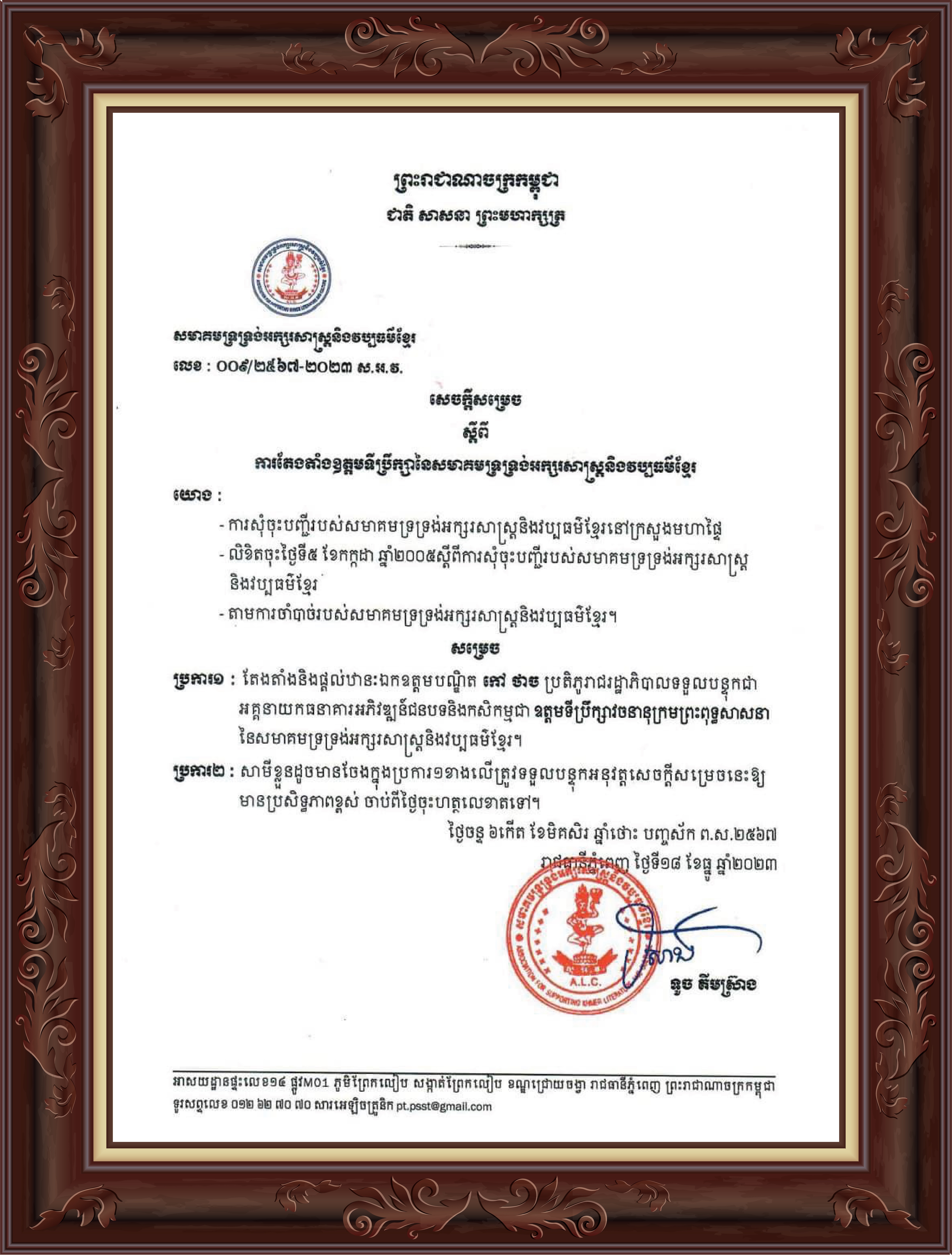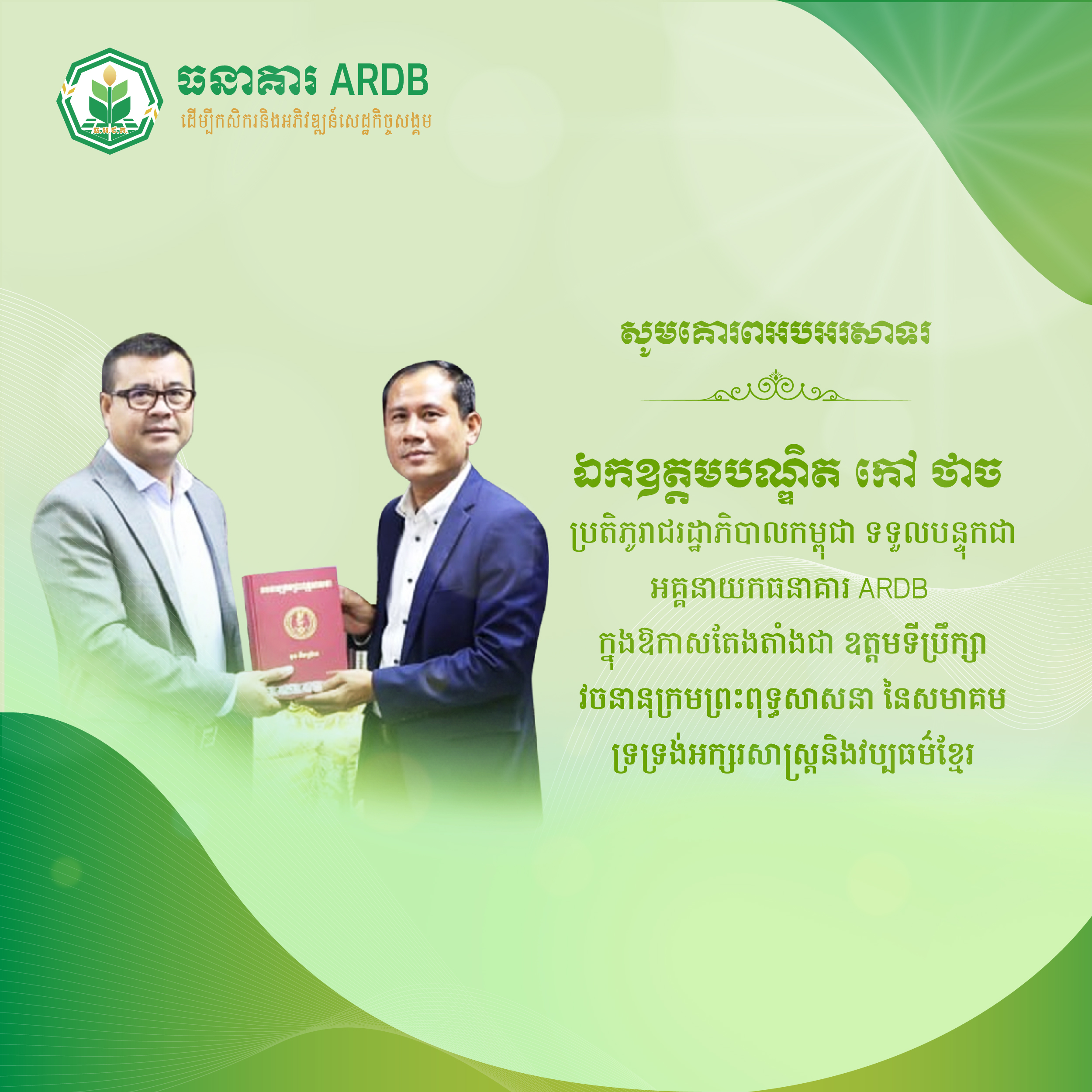 ថ្នាក់ដឹកនាំ និងបុគ្គលិកទាំងអស់នៃធនាគារអភិវឌ្ឍន៍ជនបទ និងកសិកម្ម (ARDB) សូមគោរពអបអរសាទរ ឯកឧត្ដមបណ្ឌិត កៅ ថាច ប្រតិភូរាជរដ្ឋាភិបាលកម្ពុជា ទទួលបន្ទុកជាអគ្គនាយកធនាគារ ARDB ក្នុងឱកាសតែងតាំងជា ឧត្តមទីប្រឹក្សាវចនានុក្រមព្រះពុទ្ធសាសនា នៃសមាគមទ្រទ្រង់អក្សរសាស្រ្តនិងវប្បធម៍ខ្មែរ