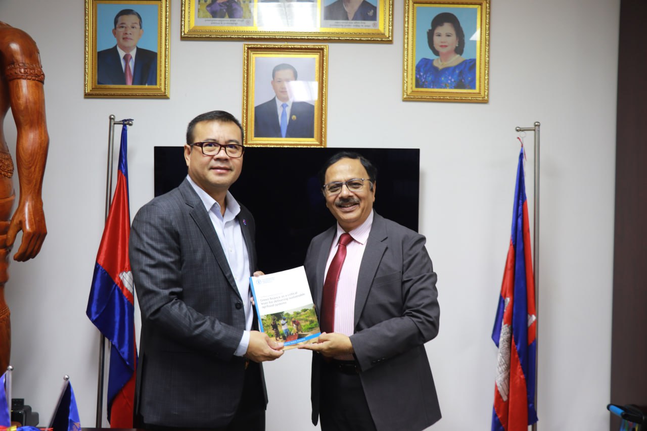 ឯកឧត្តមបណ្ឌិត កៅ ថាច ប្រតិភូរាជរដ្ឋាភិបាលទទួលបន្ទុកជាអគ្គនាយកធនាគារអភិវឌ្ឍន៍ជនបទ និងកសិកម្ម (ARDB) អមដោយអគ្គនាយករង និងសហការីនៃធនាគារ ARDB បានអនុញ្ញាតទទួលជួបសំដែងការគួរសមជាមួយ លោកបណ្ឌិត Prasun Kumar Dar, អគ្គលេខាធិការ នៃ Asia Pacific Rural and Agricultural Credit Association (APRACA) និងពិភាក្សាអំពីលទ្ធភាពកិច្ចសហប្រតិបត្តិការបន្ថែមនាពេលខាងមុខ នាថ្ងៃទី២៦ ខែមីនា ឆ្នាំ២០២៤ នៅទីស្នាក់ការកណ្តាលធនាគារ ARDB។ ក្នុងឱកាសនេះផងដែរ, លោកបណ្ឌិត Prasun ក៏បានប្រគល់សៀវភៅមួយក្បាលជូន ឯកឧត្តមបណ្ឌិត កៅ ថាច ដែលសៀវភៅនោះត្រូវបានសរសេរដោយលោកបណ្ឌិត Prasun ផ្ទាល់ នឹងផ្តោតសំខាន់ទៅលើ ការផ្តល់ហិរញ្ញប្បទានបៃតង ជាសកល។