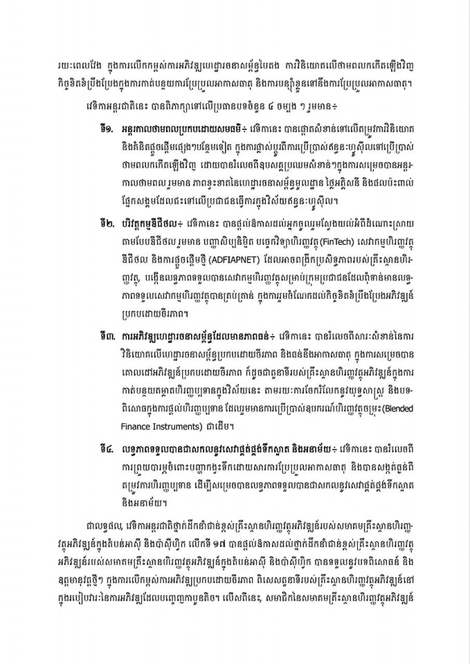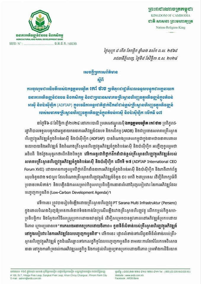 សេចក្តីប្រកាសព័ត៍មានស្តីអំពី ការអញ្ជើញចូលរួមជាអធិបតីភាព របស់ ឯកឧត្តមបណ្ឌិត កៅ ថាច ប្រតិភូរាជរដ្ឋាភិបាលទទួលបន្ទុកជា អគ្គនាយកធនាគារអភិវឌ្ឍន៍ជនបទ និងកសិកម្ម (ARDB) និងជាប្រធានសមាគមគ្រឹះស្ថានហិរញ្ញវត្ថុអភិវឌ្ឍន៍ក្នុងតំបន់អាស៊ី និងប៉ាស៊ីហ្វិក (ADFIAP) ក្នុងវេទិកាអន្តរជាតិថ្នាក់ដឹកនាំជាន់ខ្ពស់របស់សមាគមគ្រឹះស្ថានហិរញ្ញវត្ថុអភិវឌ្ឍន៍ក្នុងតំបន់អាស៊ី និងប៉ាស៊ីហ្វិក លើកទី ១៧ (ADFIAP International CEO Forum XVII) នាថ្ងៃទី៦-៨ ខែវិច្ឆិកា ឆ្នាំ២០២៤ នៅកោះបាលី នៃប្រទេសឥណ្ឌូនេស៊ី ក្រោមប្រធានបទ “ការកសាងអនាគតប្រកបដោយចីរភាព៖ តួនាទីដ៏សំខាន់របស់គ្រឹះស្ថានហិរញ្ញវត្ថុអភិវឌ្ឍន៍នៅក្នុងរបៀបវារៈនៃការអភិវឌ្ឍដែលបញ្ចេញកាបូនតិច”។