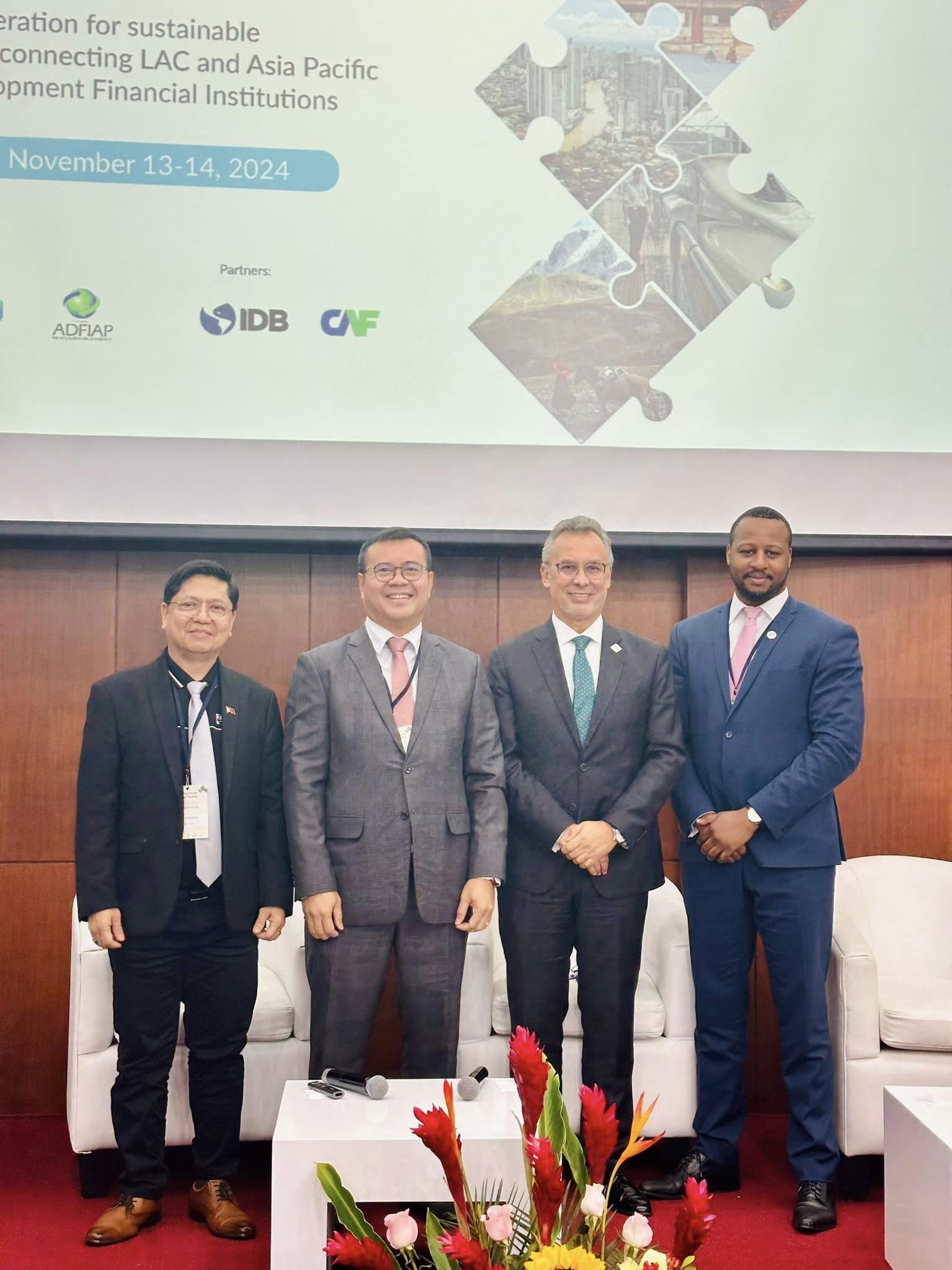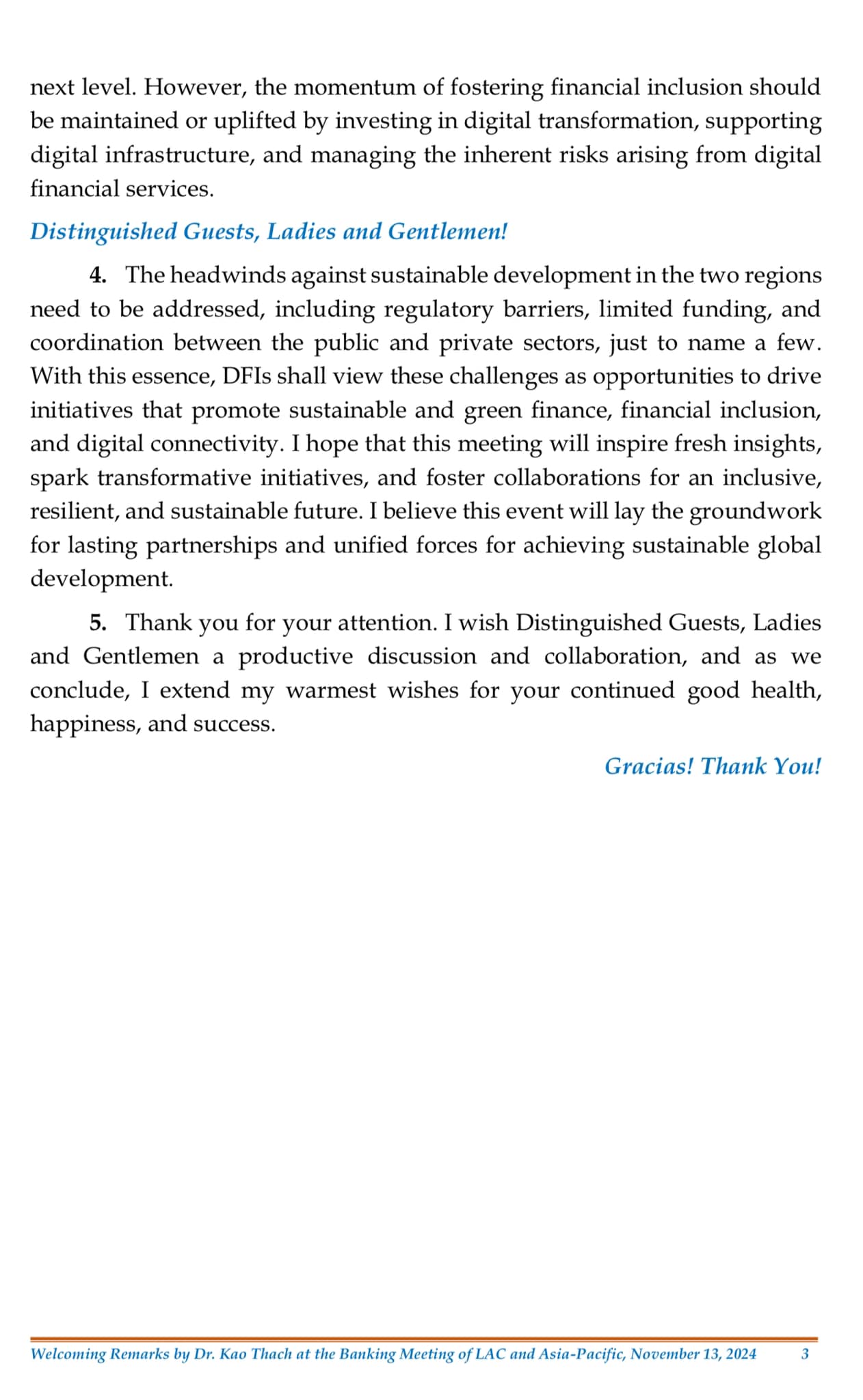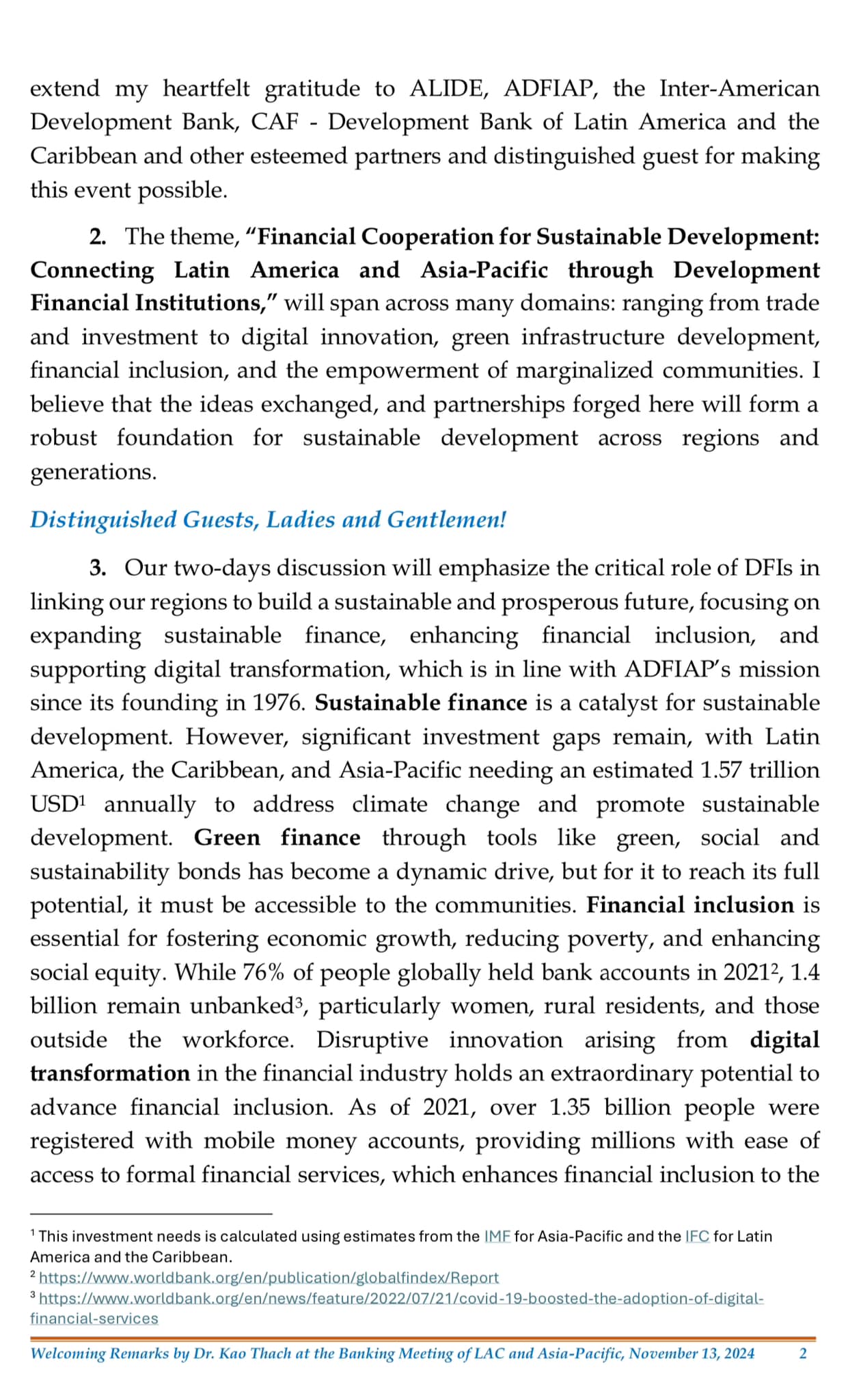 ឆ្លៀតឱកាសនេះ ឯកឧត្តមបណ្ឌិតបានគូសបញ្ជាក់ថា “តំបន់ទាំងពីរមានចម្ងាយឆ្ងាយពីគ្នា និងមានព្រំខ័ណ្ឌដោយមហាសមុទ្រប៉ាស៊ីហ្វិកយ៉ាងណាក្តី តែតួនាទីជាធនាគារអភិវឌ្ឍន៍ និងគោលដៅរួមតែមួយគឺការផ្តល់ហិរញ្ញប្បទានសម្រាប់ការអភិវឌ្ឍប្រកបដោយចីរភាព តាមរយៈហិរញ្ញប្បទានបៃតង, បរិយាបន្នហិរញ្ញវត្ថុ, បរិវត្តកម្មឌីជីថល ជាដើម។”