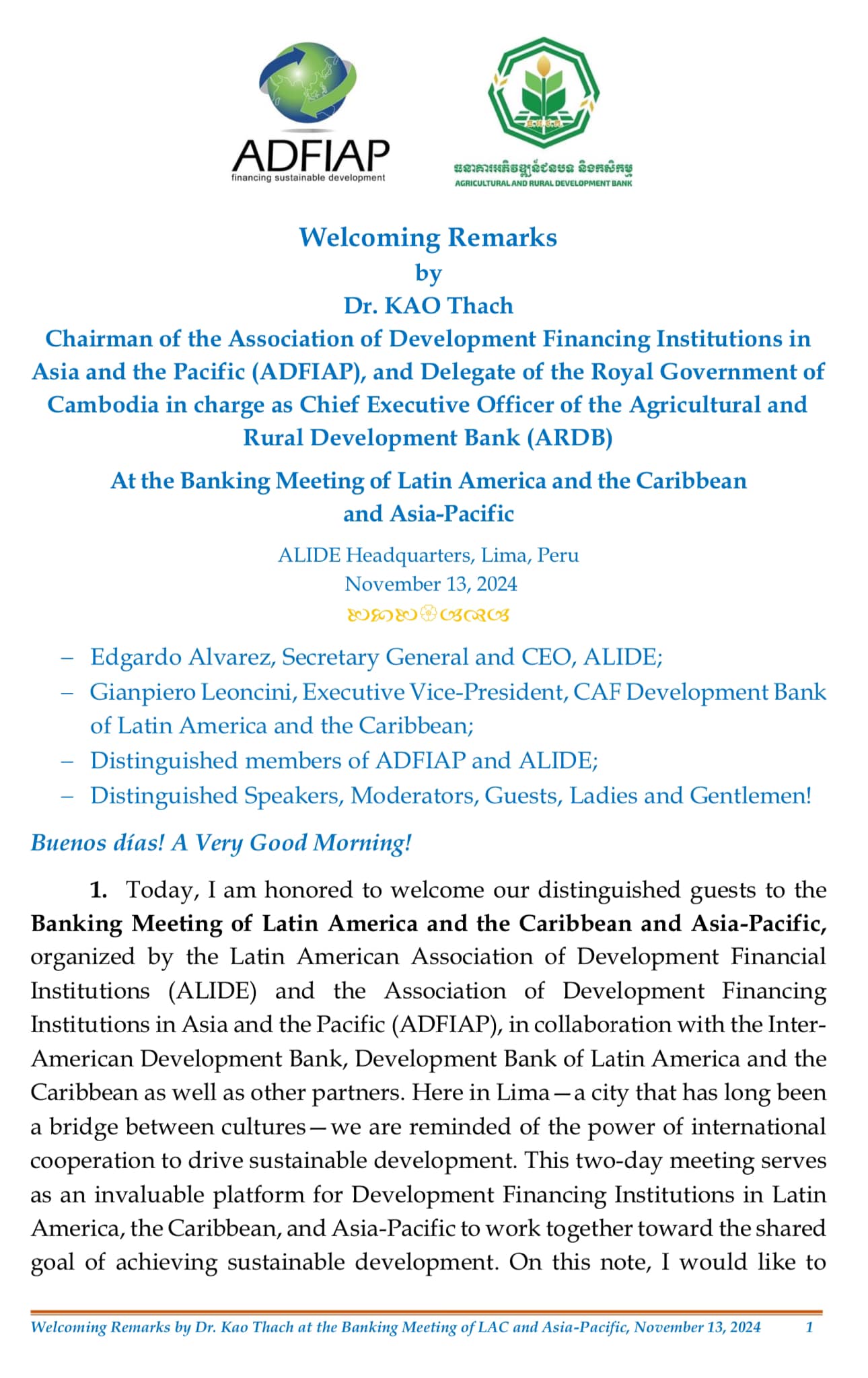 ទីស្នាក់ការ ALIDE ទីក្រុងលីម៉ា ប្រទេសប៉េរូ៖ ឯកឧត្តមបណ្ឌិត កៅ ថាច ប្រតិភូរាជរដ្ឋាភិបាលទទួលបន្ទុកជាអគ្គនាយកនៃធនាគារ ARDB និងជាប្រធានសមាគមន៍គ្រឹះស្ថានហិរញ្ញវត្ថុអភិវឌ្ឍន៍ ADFIAP បានថ្លែងសុន្ទរកថាបើកកិច្ចប្រជុំអន្តរជាតិនៃគ្រឹះស្ថានហិរញ្ញវត្ថុអភិវឌ្ឍន៍ក្រោមប្រធានបទ”កិច្ចសហប្រតិបត្តិការហិរញ្ញវត្ថុដើម្បីការអភិវឌ្ឍប្រកបដោយចីរភាព ការតភ្ជាប់តំបន់អាមេរិកឡាទីន និងតំបន់ខារ៉ាប៊ែន និងតំអាស៊ី -ប៉ាស៊ីហ្វិក ៖ តាមរយៈគ្រឹះស្ថានហិរញ្ញវត្ថុអភិវឌ្ឍន៍”។