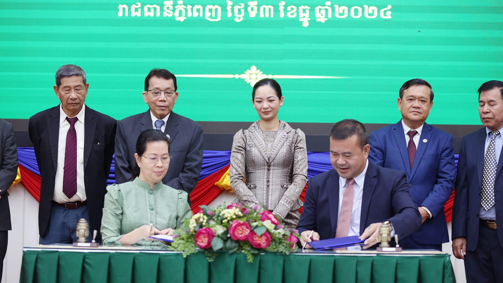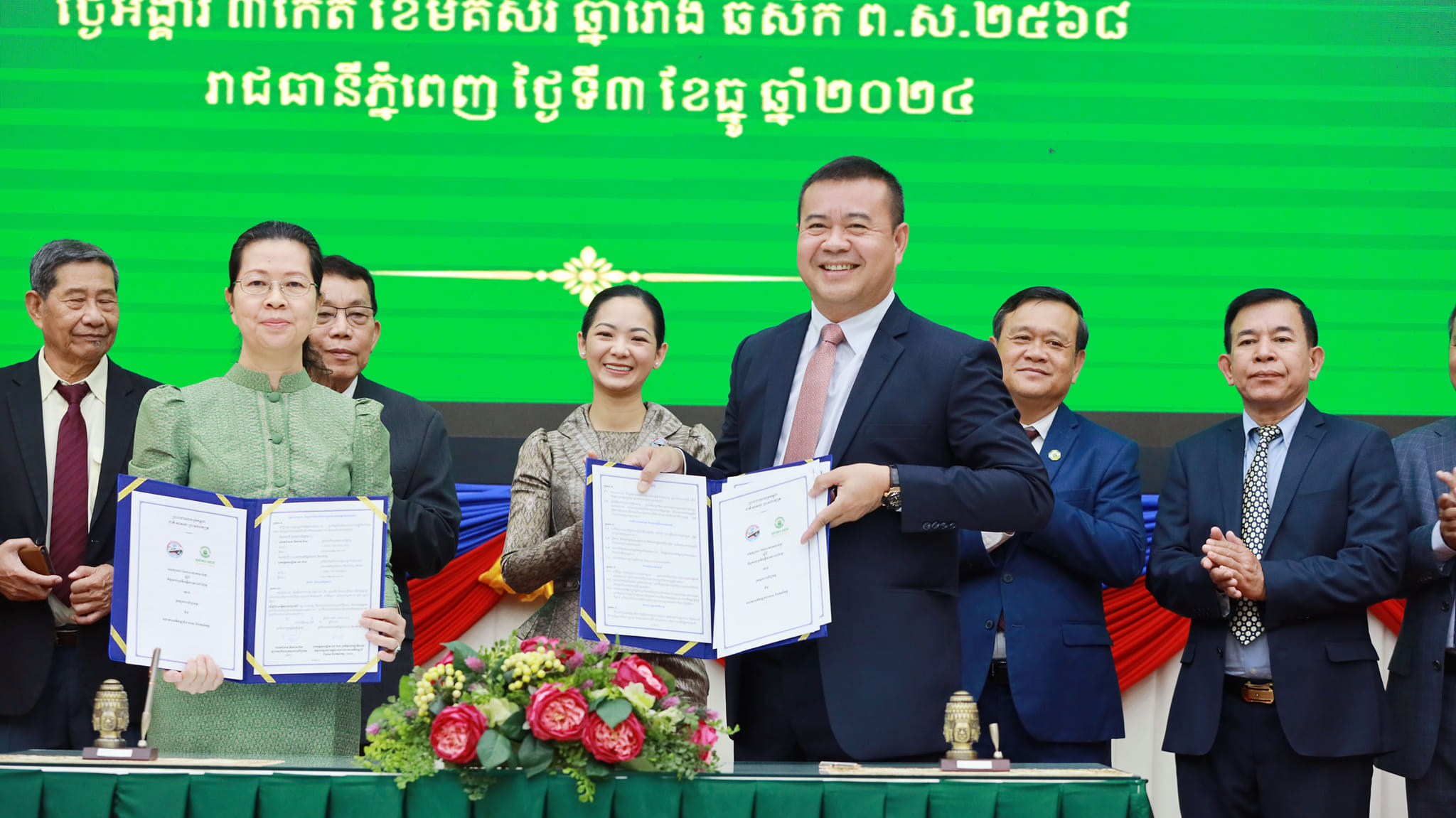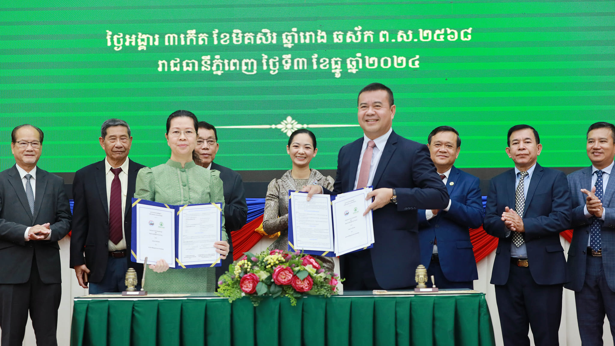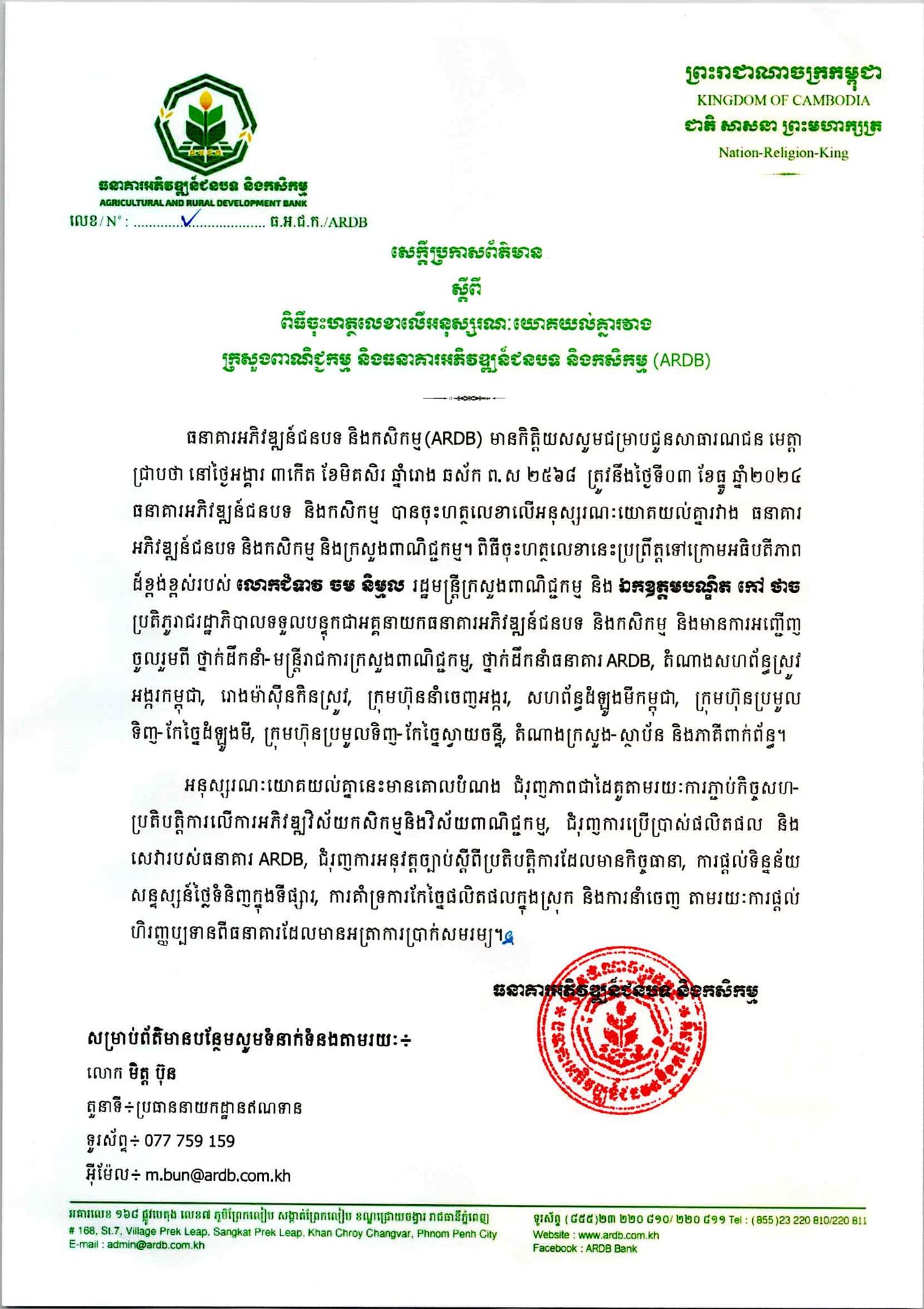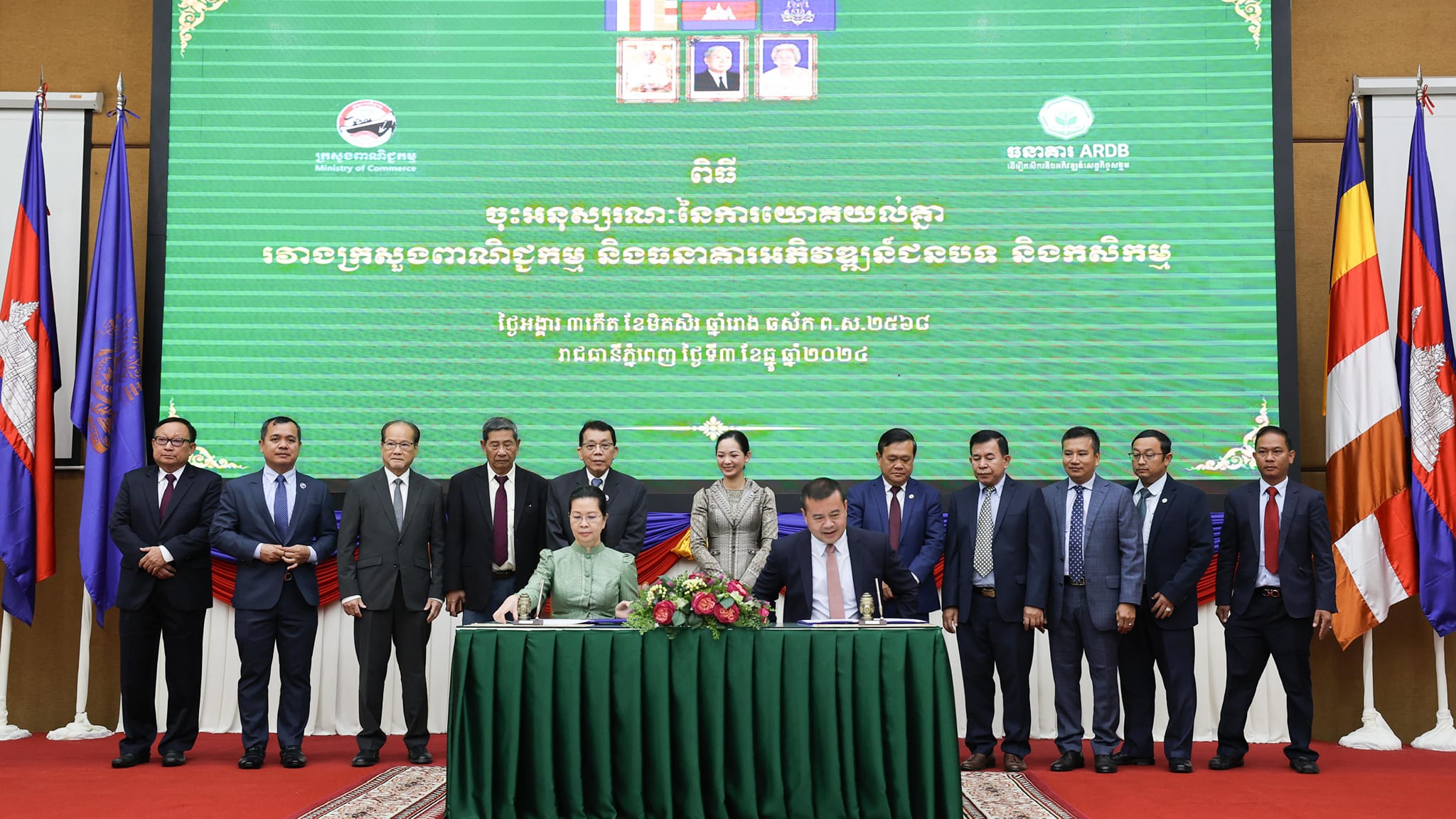 (ភ្នំពេញ): លោកជំទាវ ចម និម្មល រដ្ឋមន្រ្តីក្រសួងពាណិជ្ជកម្ម នៅព្រឹកថ្ងៃអង្គារទី៣ ខែធ្នូ ឆ្នាំ២០២៤ បានអញ្ជើញជាអធិបតីដ៏ខ្ពង់ខ្ពស់ក្នុងពិធីចុះអនុស្សរណៈយោគយល់គ្នារវាង ធនាគារអភិវឌ្ឍន៍ជនបទ និងកសិកម្ម តំណាងដោយ ឯកឧត្តមបណ្ឌិត កៅ ថាច ប្រតិភូរាជរដ្ឋាភិបាលទទួលបន្ទុកជាអគ្គនាយកធនាគារអភិវឌ្ឍន៍ជនបទ និងកសិកម្ម និងក្រសួងពាណិជ្ជកម្មតំណាងដោយ លោកជំទាវ តឹករ៉េត កំរង រដ្ឋលេខាធិការនៃក្រសួងពាណិជ្ជកម្ម ដោយមានការអញ្ជើញចូលរួមពី ថ្នាក់ដឹកនាំ-មន្រ្តីរាជការក្រសួងពាណិជ្ជកម្ម, ថ្នាក់ដឹកនាំធនាគារ ARDB, តំណាងសហព័ន្ធស្រូវអង្ករកម្ពុជា, រោងម៉ាស៊ីនកិនស្រូវ, ក្រុមហ៊ុននាំចេញអង្ករ, សហព័ន្ធដំឡូងមីកម្ពុជា, ក្រុមហ៊ុនប្រមូលទិញ-កែច្នៃដំឡូងមី, ក្រុមហ៊ុនប្រមូលទិញ-កែច្នៃស្វាយចន្ទី, តំណាងក្រសួង-ស្ថាប័ន និងភាគីពាក់ព័ន្ធផ្សេងៗទៀត នៅទីស្តីការក្រសួងពាណិជ្ជកម្ម ដែលមានអ្នកចូលរួមប្រមាណ ១៥០នាក់។