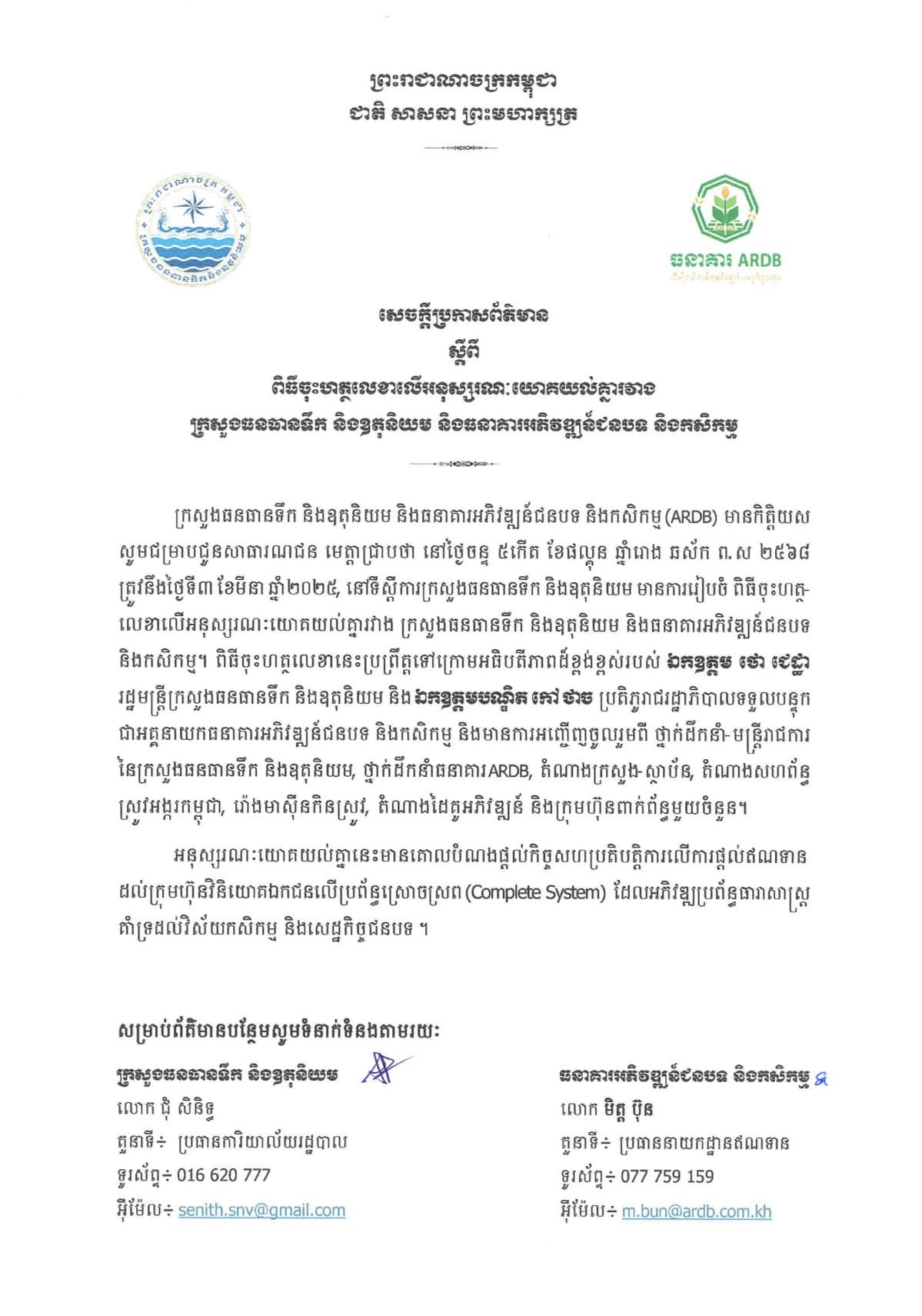 សេចក្តីប្រកាសព័ត៌មានស្តីពី ពិធីចុះហត្ថលេខាលើអនុស្សរណៈយោគយល់គ្នារវាងក្រសួងធនធានទឹក និងឧតុនិយម និងធនាគារអភិវឌ្ឍន៍ជនបទ និងកសិកម្ម