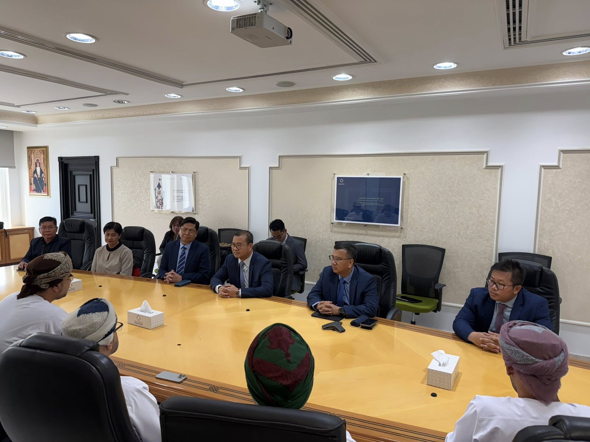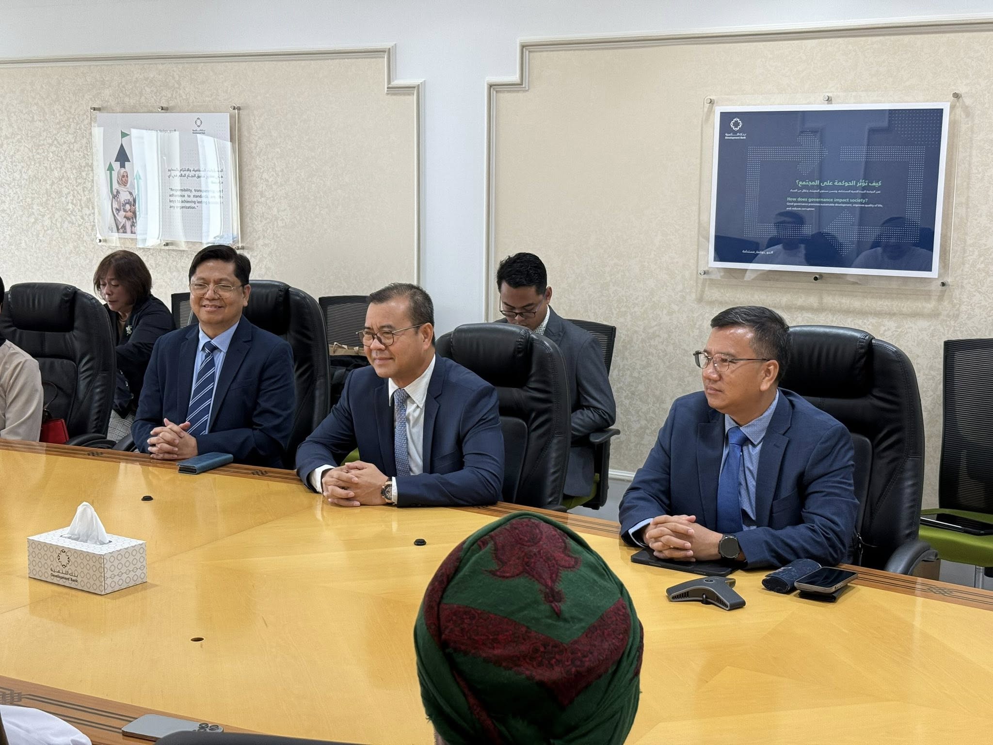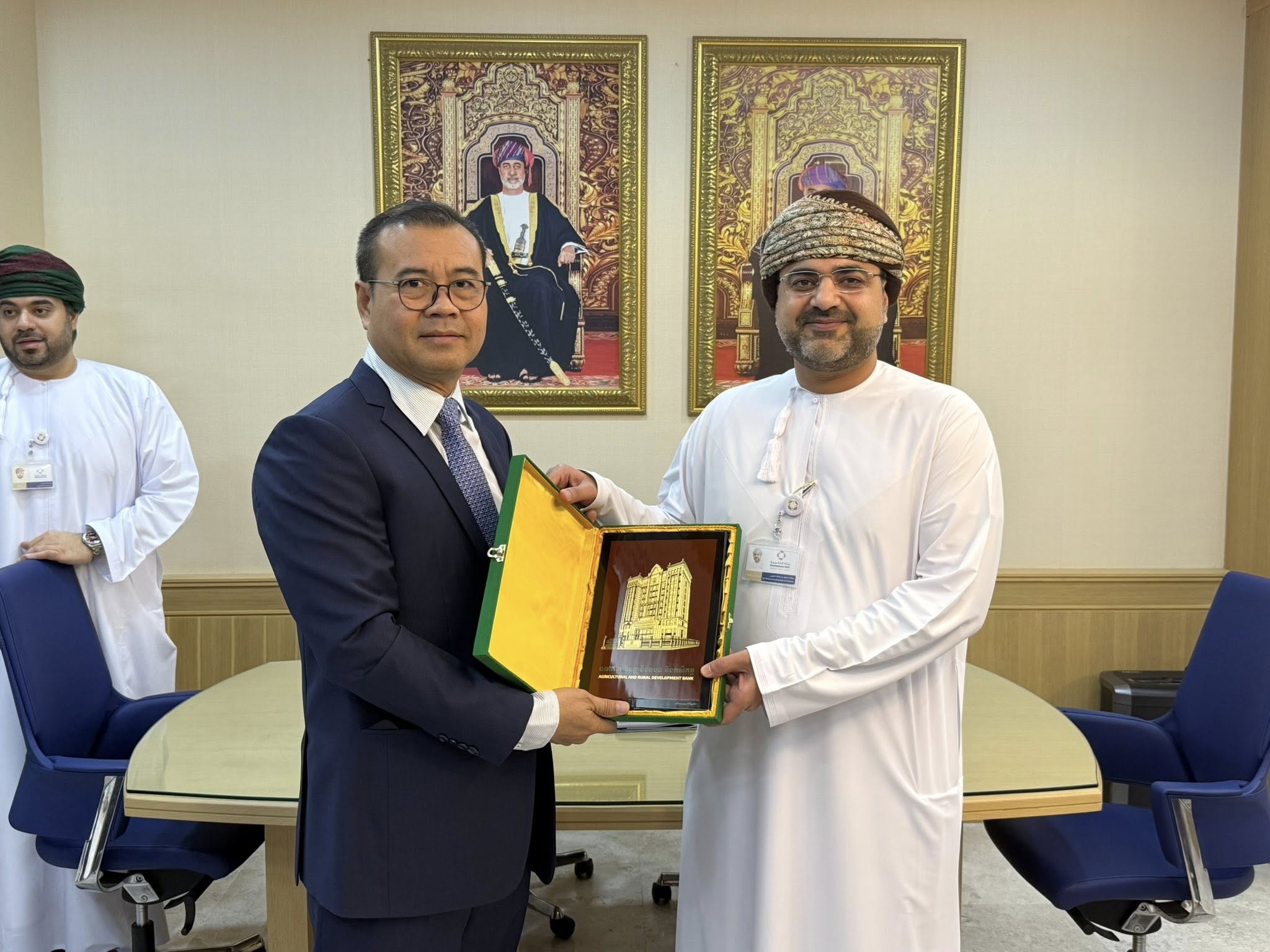 ទីក្រុងមូស្កាត, ប្រទេសអូម៉ង់៖ នៅព្រឹក ថ្ងៃចន្ទ ៩រោច ខែចេត្រ ឆ្នាំម្សាញ់ សប្តស័ក ពុទ្ធសករាជ ២៥៦៨ ត្រូវនឹងថ្ងៃទី២១ ខែមេសា ឆ្នាំ២០២៥ នេះ ឯកឧត្តមបណ្ឌិត កៅ ថាច ប្រតិភូរាជរដ្ឋាភិបាលទទួលបន្ទុកជាអគ្គនាយក ធនាគារអភិវឌ្ឍន៍ជនបទ និងកសិកម្ម (ARDB) និងជាប្រធានសមាគមគ្រឹះស្ថានហិរញ្ញវត្ថុអភិវឌ្ឍន៍ក្នុងតំបន់អាស៊ី និងប៉ាស៊ីហ្វិក (ADFIAP) រួមជាមួយលោក Enrique I. Florencio អគ្គលេខាធិការ ADFIAP និងសហការី បានជួបសម្ដែងការគួរសម និងពិភាក្សាការងារជាមួយ ឯកឧត្តម Mahmood Abdullah Al Aweini អគ្គលេខាធិការក្រសួងហិរញ្ញវត្ថុ និងជាប្រធានក្រុមប្រឹក្សាភិបាល នៃធនាគារអភិវឌ្ឍន៍ របស់អូម៉ង់ ព្រមទាំងសមាជិកក្រុមប្រឹក្សាភិបាល និងថ្នាក់ដឹកនាំជាន់ខ្ពស់នៃធនាគារអភិវឌ្ឍន៍ របស់អូម៉ង់ នៅទីស្នាក់ការកណ្ដាល នៃធនាគារអភិវឌ្ឍន៍។