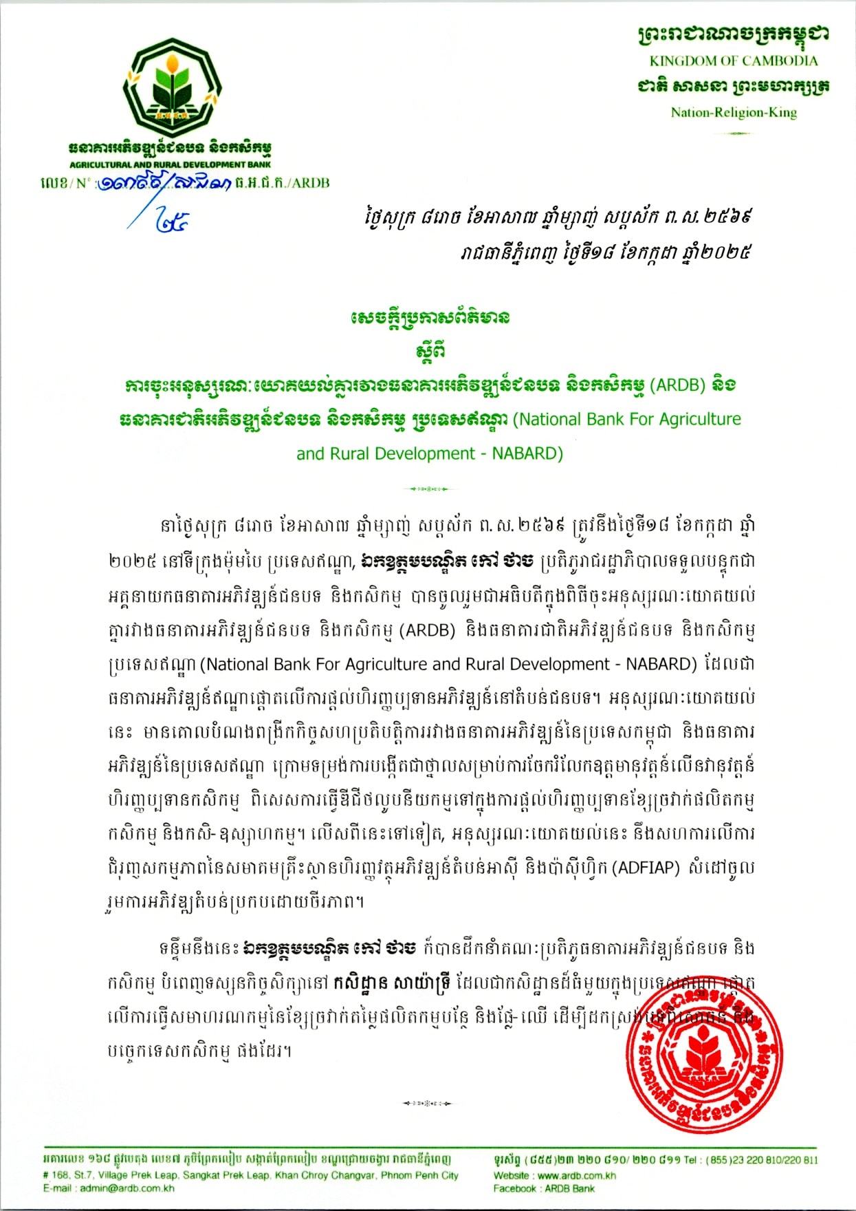 សេចក្តីប្រកាសព័ត៌មានស្តីពីការចុះអនុស្សរណៈយោគយល់គ្នារវាងធនាគារអភិវឌ្ឍន៍ជនបទ និងកសិកម្ម (ARDB) និង ធនាគារជាតិអភិវឌ្ឍន៍ជនបទ និងកសិកម្ម ប្រទេសឥណ្ឌា (National Bank For Agriculture and Rural Development – NABARD)