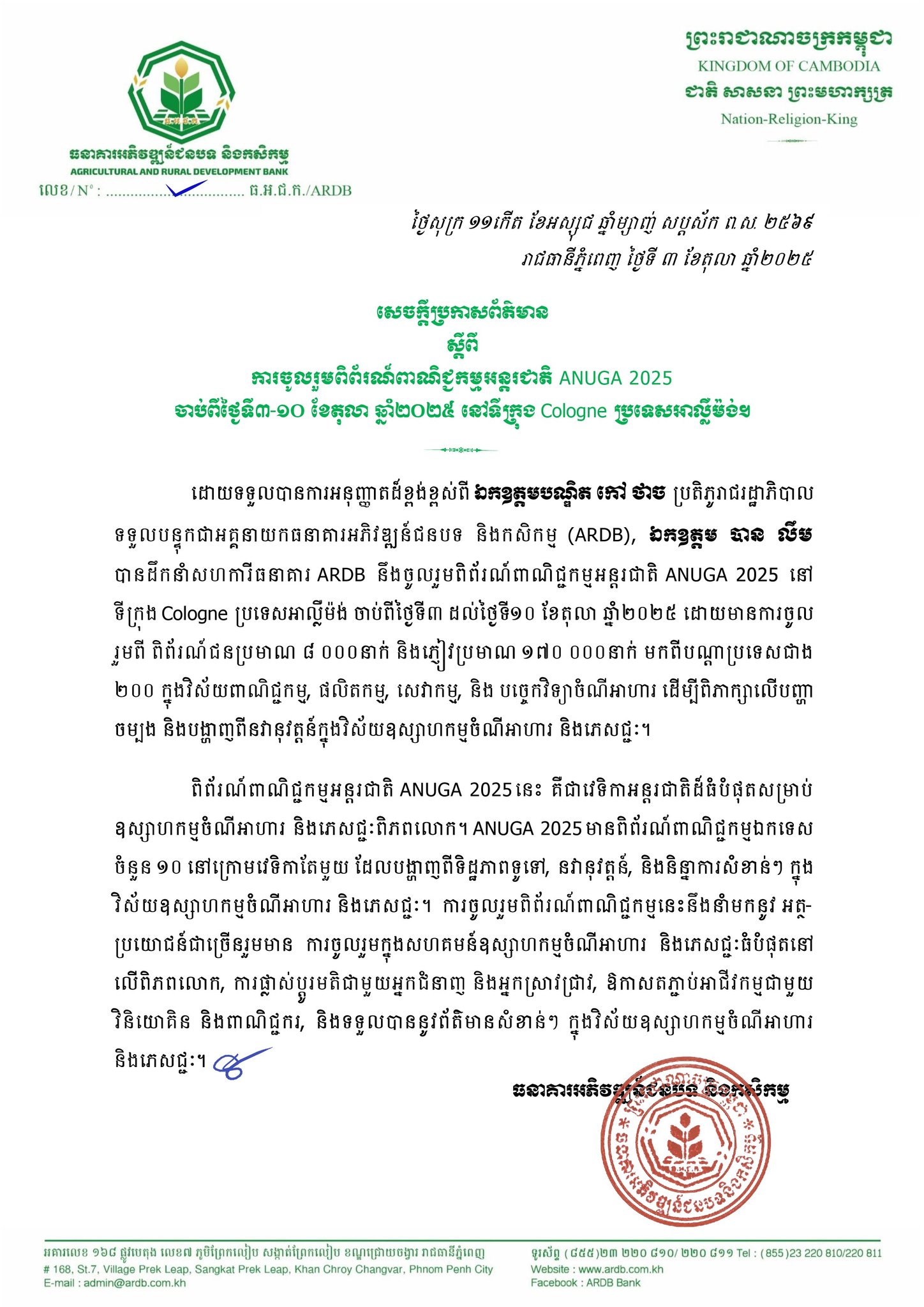 5 October 2025 សេចក្តីប្រកាសព័ត៌មានរបស់ធនាគាARDB ស្តីពី ការចូលរួមពិព័រណ៍ពាណិជ្ជកម្មអន្តរជាតិ ANUGA 2025 ចាប់ពីថ្ងៃទី៣ ដល់ថ្ងៃទី១០ ខែតុលា ឆ្នាំ២០២៥ នៅទីក្រុង Cologne ប្រទេសអាល្លឺម៉ង់ Post navigation Previous ឯកឧត្តមបណ្ឌិត កៅ ថាច ដឹកនាំសហការី អញ្ជើញទស្សនកិច្ច ពិនិត្យមើលកសិដ្ឋាន មូមូ ហ្វាម (Moo Moo Farms) ចិញ្ចឹមគោយកទឹកដោះបែបធម្មជាតិ ស្ថិតនៅសង្កាត់ បារ៉ុង ក្រុងអរិយក្សត្រNext Commodity Prices Date: 6 October 2025