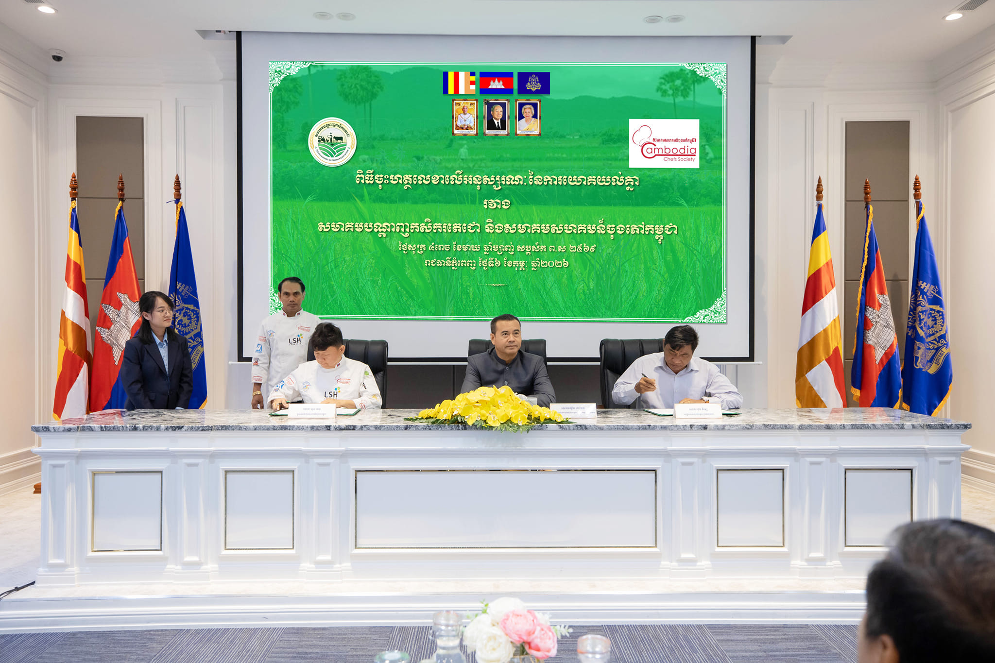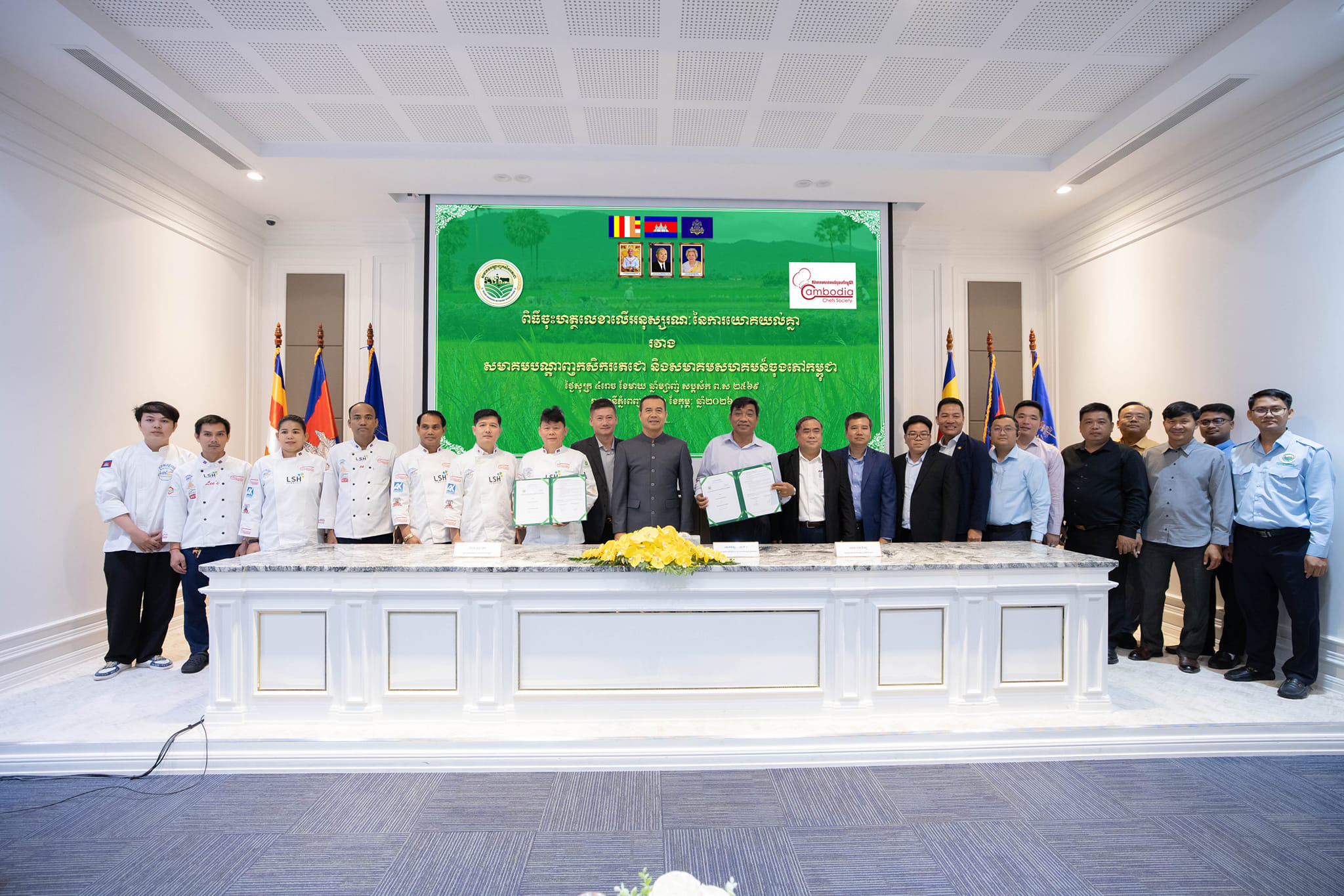 ឆ្លៀតក្នុងឱកាសនេះ ឯកឧត្ដមបណ្ឌិតប្រតិភូ ក៏បានផ្តល់កិត្តិយសអញ្ជើញចូលរួមជាសក្សីក្នុងពិធីចុះហត្ថលេខាលើអនុស្សរណៈនៃការយោគយល់គ្នា រវាងសមាគមបណ្តាញកសិករតេជោ និងសមាគមសហគមន៍ចុងភៅកម្ពុជា ដើម្បីជំរុញកិច្ចសហប្រតិបត្តិការរវាងសមាគមទាំងពីរផងដែរ។