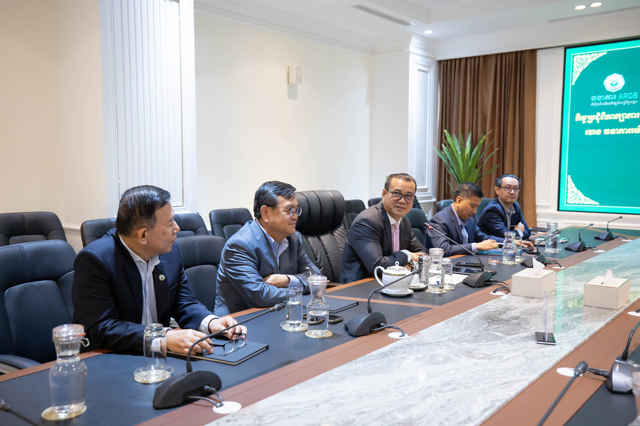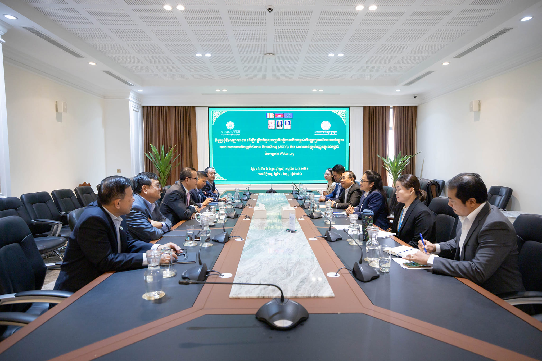 H.E. Dr. KAO Thach, Delegate of the Royal Government in Charge as Chief Executive Officer of the Agricultural and Rural Development Bank (ARDB), accompanied by his colleagues, welcomed a delegation from the Cambodia Microfinance Association (CMA) and representatives of Water.org for a discussion on potential collaboration in promoting green finance in Cambodia. The discussion aimed to promote financial inclusion and expand sustainable financing opportunities.